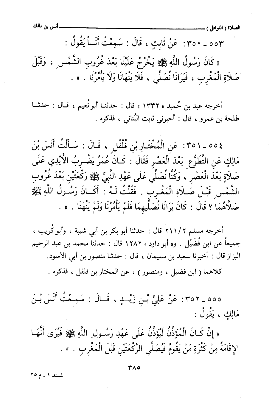 - وفي رواية: صَلَّيْتُ الرَّكْعَتَيْنِ قَبْلَ الْمَغْرِبِ، عَلَى عَهْدِ رَسُولِ اللهِ صلى الله عليه وسلم. قَالَ: قُلْتُ لأَنَسٍ: أَرَآكُمْ رَسُولُ اللهِ صلى الله عليه وسلم؟ قَالَ: نَعَمْ، رَآنَا، فَلَمْ يَأْمُرْنَا وَلَمْ يَنْهَنَا.