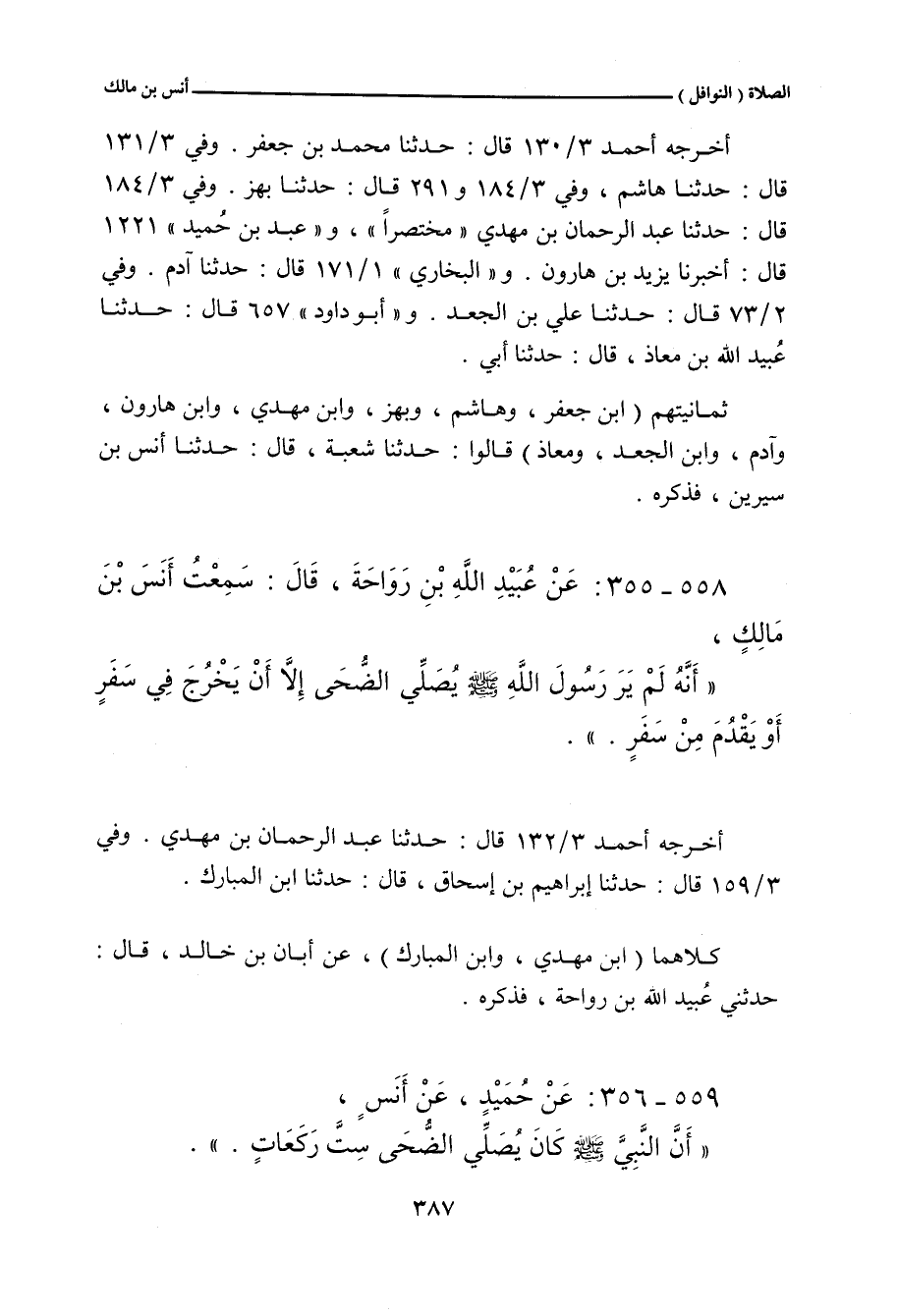 أَنَّهُ لَمْ يَرَ رَسُولَ اللهِ صلى الله عليه وسلم يُصَلِّي الضُّحَى، إِلَاّ أَنْ يَخْرُجَ فِي سَفَرٍ، أَوْ يَقْدَمَ مِنْ سَفَرٍ.