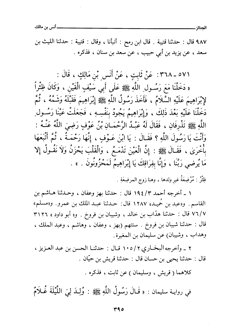 وُلِدَ لِىَ اللَّيْلَةَ غُلَامٌ، فَسَمَّيْتُهُ بِاسْمِ أَبِي إِبْرَاهِيمَ، قَالَ: ثُمَّ دَفَعَهُ إِلَى أُمِّ سَيْفٍ، امْرَأَةِ قَيْنٍ، يُقَالُ لَهُ: أَبُو سَيْفٍ، بِالْمَدِينَةِ، قَالَ: فَانْطَلَقَ رَسُولُ اللَّهِ صلى الله عليه وسلم يَأْتِيهِ، وَانْطَلَقْتُ مَعَهُ، فَانْتَهَيْتُ إِلَى أَبِي سَيْفٍ، وَهُوَ يَنْفُخُ بِكِيرِهِ، وَقَدِ امْتَلأَ الْبَيْتُ دُخَانًا، قَالَ: فَأَسْرَعْتُ الْمَشْيَ بَيْنَ يَدَيْ رَسُولِ اللَّهِ صلى الله عليه وسلم، قَالَ: فَقُلْتُ: يَا أَبَا سَيْفٍ، جَاءَ رَسُولُ اللَّهِ صلى الله عليه وسلم، قَالَ: فَأَمْسَكَ، قَالَ: فَجَاءَ رَسُولُ اللَّهِ صلى الله عليه وسلم، فَدَعَا بِالصَّبِيِّ، فَضَمَّهُ إِلَيْهِ، قَالَ أَنَسٌ: فَلَقَدْ رَأَيْتُهُ بَيْنَ يَدَيْ رَسُولِ اللَّهِ صلى الله عليه وسلم، وَهُوَ يَكِيدُ بِنَفْسِهِ، قَالَ: فَدَمَعَتْ عَيْنَا رَسُولِ اللَّهِ صلى الله عليه وسلم، قَالَ: قَالَ رَسُولُ اللَّهِ صلى الله عليه وسلم: تَدْمَعُ الْعَيْنُ، وَيَحْزَنُ الْقَلْبُ، وَلَا نَقُولُ إِلَاّ مَا يَرْضَى رَبُّنَا، عَزَّ وَجَلَّ، وَاللَّهِ إِنَّا بِكَ يَا إِبْرَاهِيمُ لَمَحْزُونُونَ.