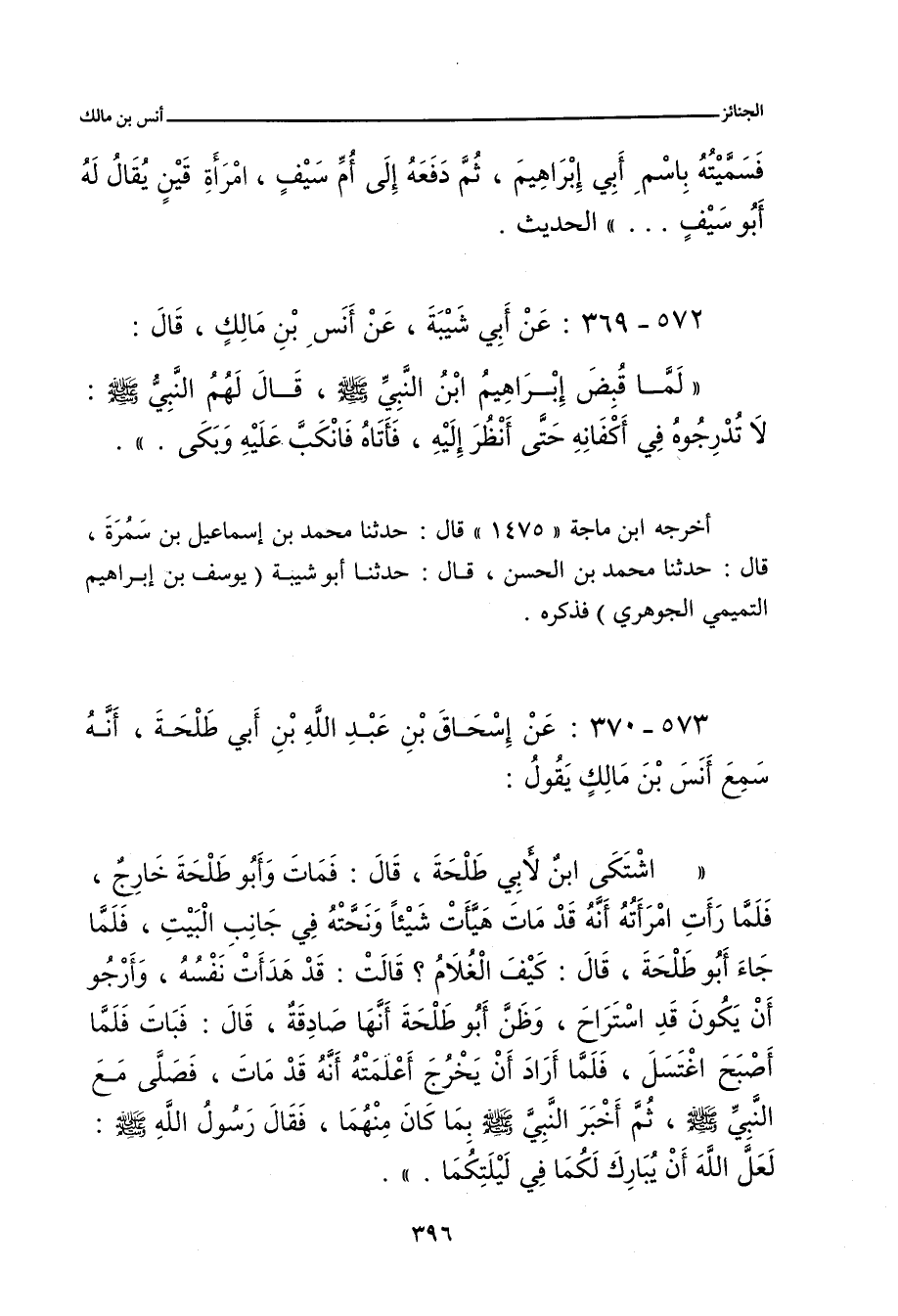 لَمَّا قُبِضَ إِبْرَاهِيمُ ابْنُ النَّبِيِّ صلى الله عليه وسلم، قَالَ لَهُمُ النَّبِيُّ صلى الله عليه وسلم: لَا تُدْرِجُوهُ فِي أَكْفَانِهِ حَتَّى أَنْظُرَ إِلَيْهِ، فَأَتَاهُ، فَانْكَبَّ عَلَيْهِ وَبَكَى.