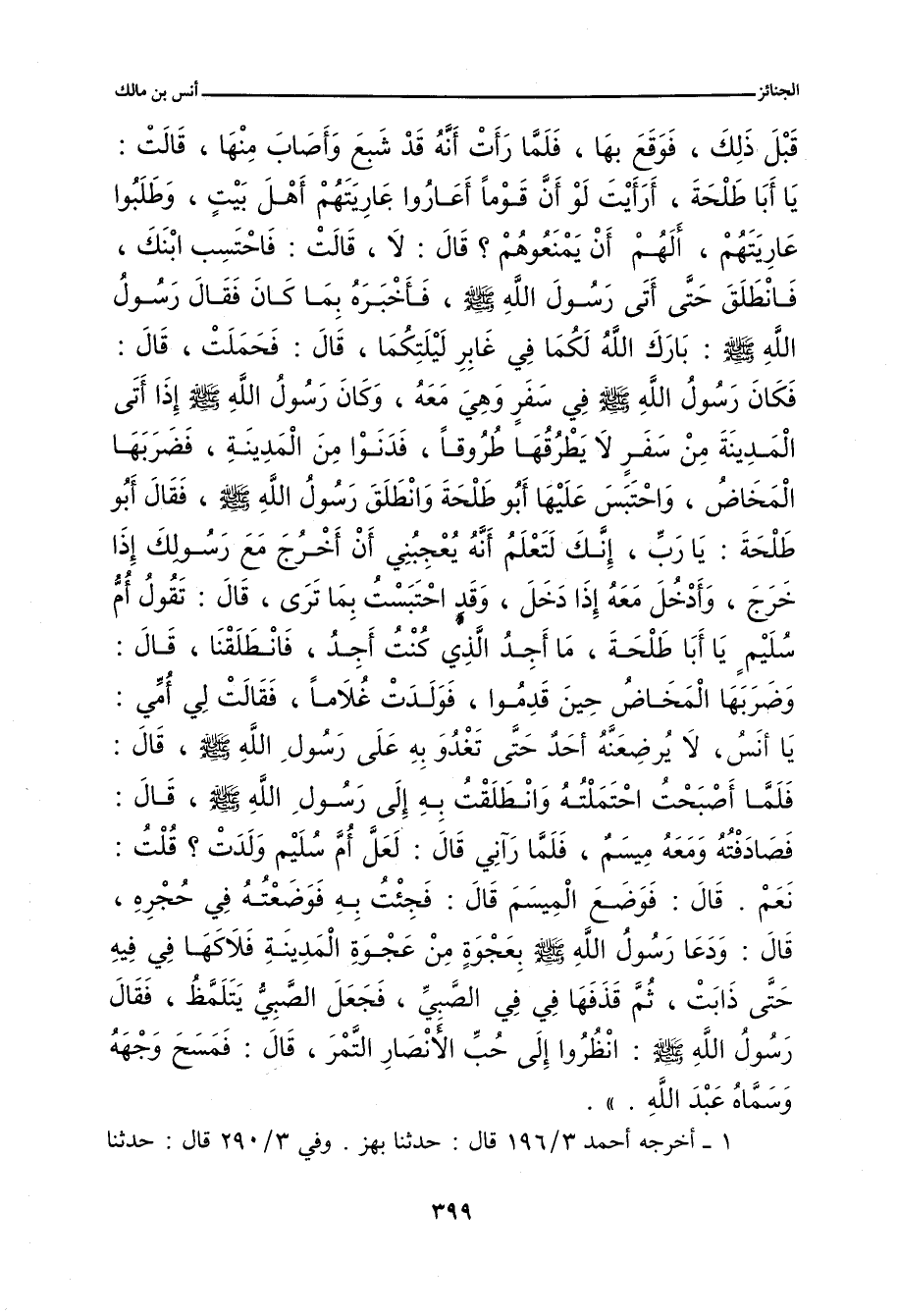 - وفي رواية: أَنَّ أَبَا طَلْحَةَ مَاتَ لَهُ ابْنٌ، فَقَالَتْ أُمُّ سُلَيْمٍ: لَا تُخْبِرُوا أَبَا طَلْحَةَ، حَتَّى أَكُونَ أَنَا الَّذِي أُخْبِرُهُ، فَسَجَّتْ عَلَيْهِ، فَلَمَّا جَاءَ أَبُو طَلْحَةَ، وَضَعَتْ بَيْنَ يَدَيْهِ طَعَامًا، فَأَكَلَ، ثُمَّ تَطَيَّبَتْ لَهُ، فَأَصَابَ مِنْهَا، فَعَلِقَتْ بِغُلَامٍ، فَقَالَتْ: يَا أَبَا طَلْحَةَ، إِنَّ آلَ فُلَانٍ اسْتَعَارُوا مِنْ آلِ فُلَانٍ عَارِيَةً، فَبَعَثُوا إِلَيْهِمُ: ابْعَثُوا إِلَيْنَا بِعَارِيَتِنَا، فَأَبَوْا أَنْ يَرُدُّوهَا، فَقَالَ أَبُو طَلْحَةَ: لَيْسَ لَهُمْ ذَلِكَ، إِنَّ الْعَارِيَةَ مُؤَدَّاةٌ إِلَى أَهْلِهَا، قَالَتْ: فَإِنَّ ابْنَكَ كَانَ عَارِيَةً مِنَ اللهِ، عَزَّ وَجَلَّ، وَإِنَّ اللَّهَ، عَزَّ وَجَلَّ، قَدْ قَبَضَهُ، فَاسْتَرْجَعَ. قَالَ أَنَسٌ: فَأُخْبِرَ النَّبِيُّ صلى الله عليه وسلم بِذَلِكَ، فَقَالَ: بَارَكَ اللَّهُ لَهُمَا فِي لَيْلَتِهِمَا. قَالَ: فَعَلِقَتْ بِغُلَامٍ فَوَلَدَتْ، فَأَرْسَلَتْ بِهِ مَعِي أُمُّ سُلَيْمٍ إِلَى النَّبِيِّ صلى الله عليه وسلم، وَحَمَلْتُ تَمْرًا، فَأَتَيْتُ بِهِ النَّبِيَّ صلى الله عليه وسلم، وَعَلَيْهِ عَبَاءَةٌ، وَهُوَ يَهْنَأُ بَعِيرًا لَهُ، فَقَالَ رَسُولُ اللهِ صلى الله عليه وسلم: هَلْ مَعَكَ تَمْرٌ؟ قَالَ: قُلْتُ: نَعَمْ، فَأَخَذَ التَّمَرَاتِ فَأَلْقَاهُنَّ فِي فِيهِ، فَلَاكَهُنَّ، ثُمَّ جَمَعَ لُعَابَهُ، ثُمَّ فَغَرَ فَاهُ فَأَوْجَرَهُ إِيَّاهُ، فَجَعَلَ الصَّبِيُّ يَتَلَمَّظُ، فَقَالَ رَسُولُ اللهِ صلى الله عليه وسلم: حُبُّ الأَنْصَارِ التَّمْرَُ، فَحَنَّكَهُ، وَسَمَّاهُ عَبْدَ اللهِ، فَمَا كَانَ فِي الأَنْصَارِ شَابٌّ أَفْضَلَ مِنْهُ.