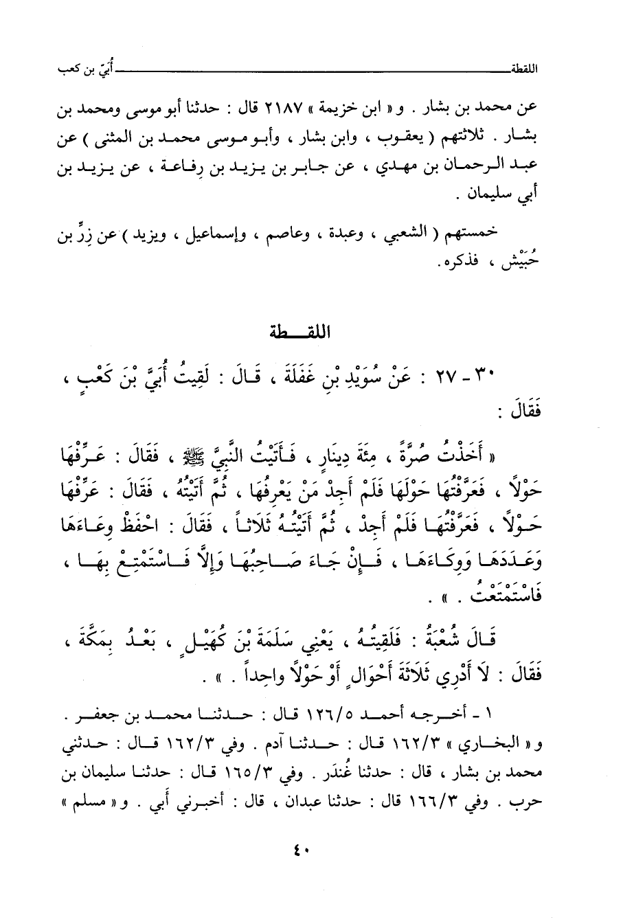 ٣٠ - عَنْ سُوَيْدِ بْنِ غَفَلَةَ، قَالَ: لَقِيتُ أُبَيَّ بْنَ كَعْبٍ، فَقَالَ: