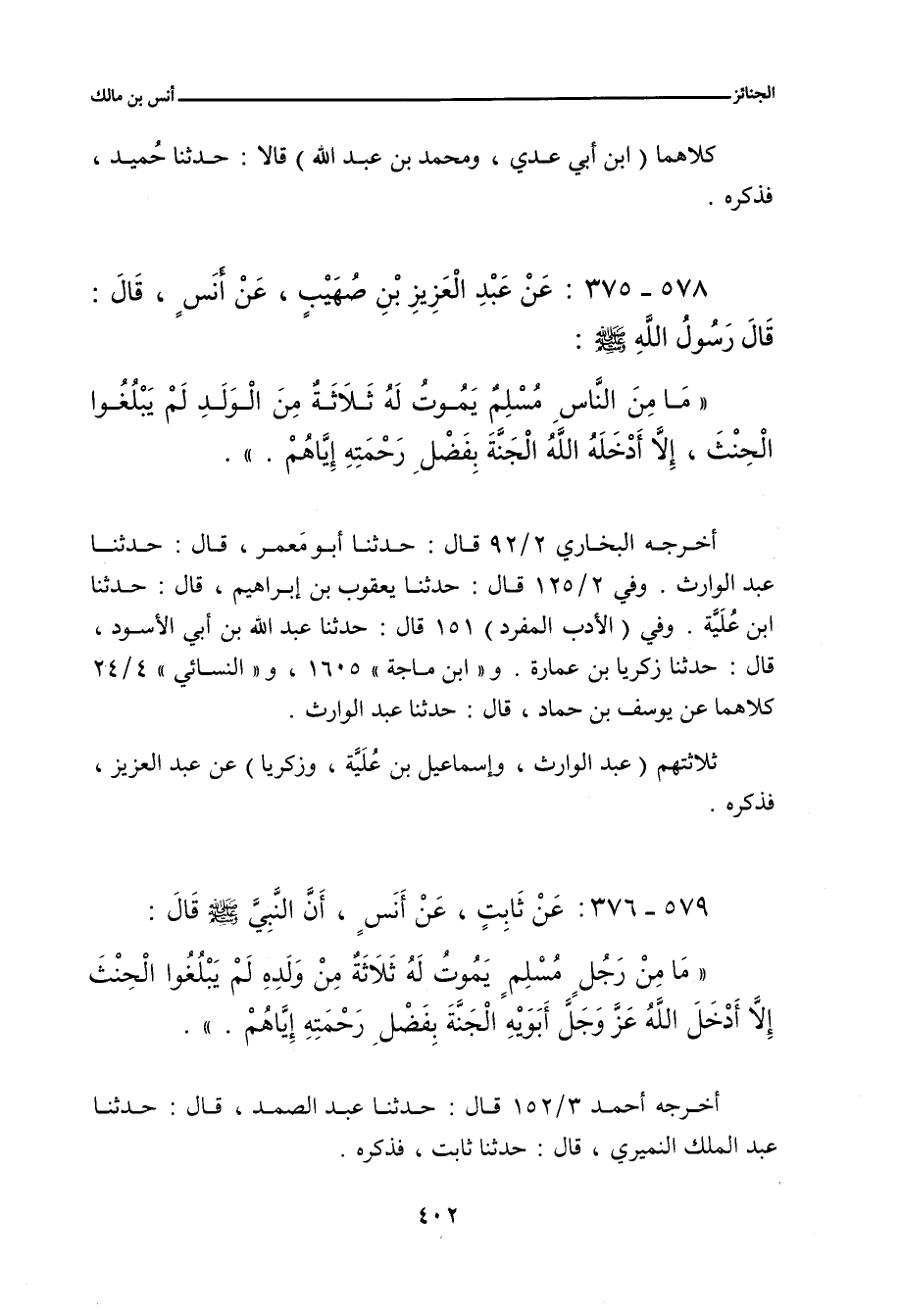- وفي رواية: مَا مِنْ مُسْلِمَيْنِ يُتَوَفَّى لَهُمَا ثَلَاثَةٌ مِنَ الْوَلَدِ، لَمْ يَبْلُغُوا الْحِنْثَ، إِلَاّ أَدْخَلَهُمُ اللَّهُ الْجَنَّةَ، بِفَضْلِ رَحْمَةِ اللهِ إِيَّاهُمْ.