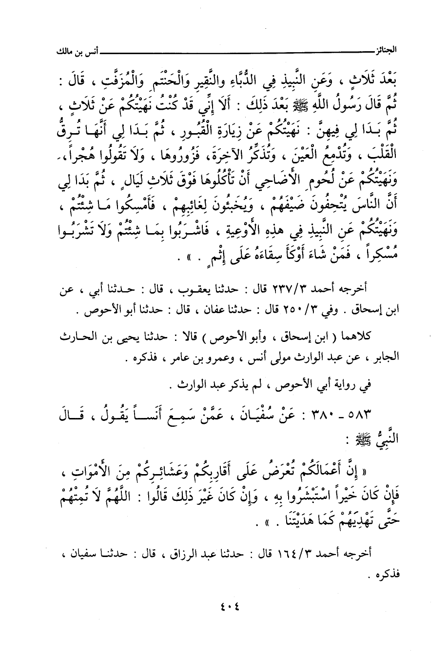 أخرجه أحمد ٣/ ٢٥٠ (١٣٦٥٠) قال: حدَّثنا عَفَّان، حدَّثنا أبو الأَحْوَص , عن يَحيى بن الحارث التَّيْمِي، عَنْ عَمْرِو بْنِ عَامِرٍ، عَنْ أَنَسِ بْنِ مَالِكٍ، قَالَ: