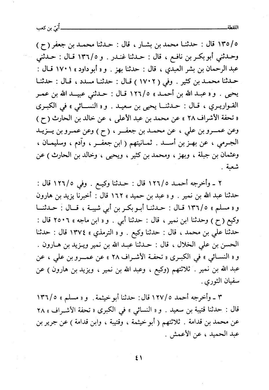٥/ ١٣٥ (٤٥٢٧) قال: حدَّثنا مُحَمد بن بَشَّار، حدَّثنا مُحَمد بن جَعْفَر، حدَّثنا شُعْبة (ح) وحدَّثني أبو بَكْر بن نافع، حدَّثنا غُنْدَر، حدَّثنا شُعْبة. وفي ٥/ ١٣٦ (٤٥٢٨) قال: حدَّثني عَبْد الرَّحْمان بن بِشْر العَبْدِي، حدَّثنا بَهْز، حدَّثنا شُعْبة. وفي (٤٥٢٩) قال: حدَّثنا قُتَيْبَة بن سَعِيد، حدَّثنا جَرِير، عن الأَعْمَش (ح) وحدَّثنا أبو بَكْر بن أَبي شَيْبَة، حدَّثنا وَكِيع (ح) وحدَّثنا ابن نُمَيْر، حدَّثنا أَبي، جميعًا عن سُفْيان (ح) وحدَّثني مُحَمد بن حاتم، حدَّثنا عَبْد الله بن جَعْفَر الرَّقِّي، حدَّثنا عُبَيْد الله، يَعْنِي ابن عَمْرو، عن زَيْد بن أَبي أُنَيْسَة (ح) وحدَّثني عَبْد الرَّحْمان بن بِشْر، حدَّثنا بَهْز، حدَّثنا حَمَّاد بن سَلَمَة. و"أبو داود" ١٧٠١ قال: حدَّثنا مُحَمد بن كَثِير، أخبرنا شُعْبة. وفي (١٧٠٢) قال: حدَّثنا مُسَدَّد، حدَّثنا يَحيى، عن شُعْبة. وفي (١٧٠٣) قال: حدَّثنا مُوسَى بن إِسْمَاعِيل، حدَّثنا حَمَّاد. و"ابن ماجة" ٢٥٠٦ قال: حدَّثنا علي بن مُحَمد، حدَّثنا وَكِيع، حدَّثنا سُفْيان. والتِّرْمِذِيّ" ١٣٧٤ قال: حدَّثنا