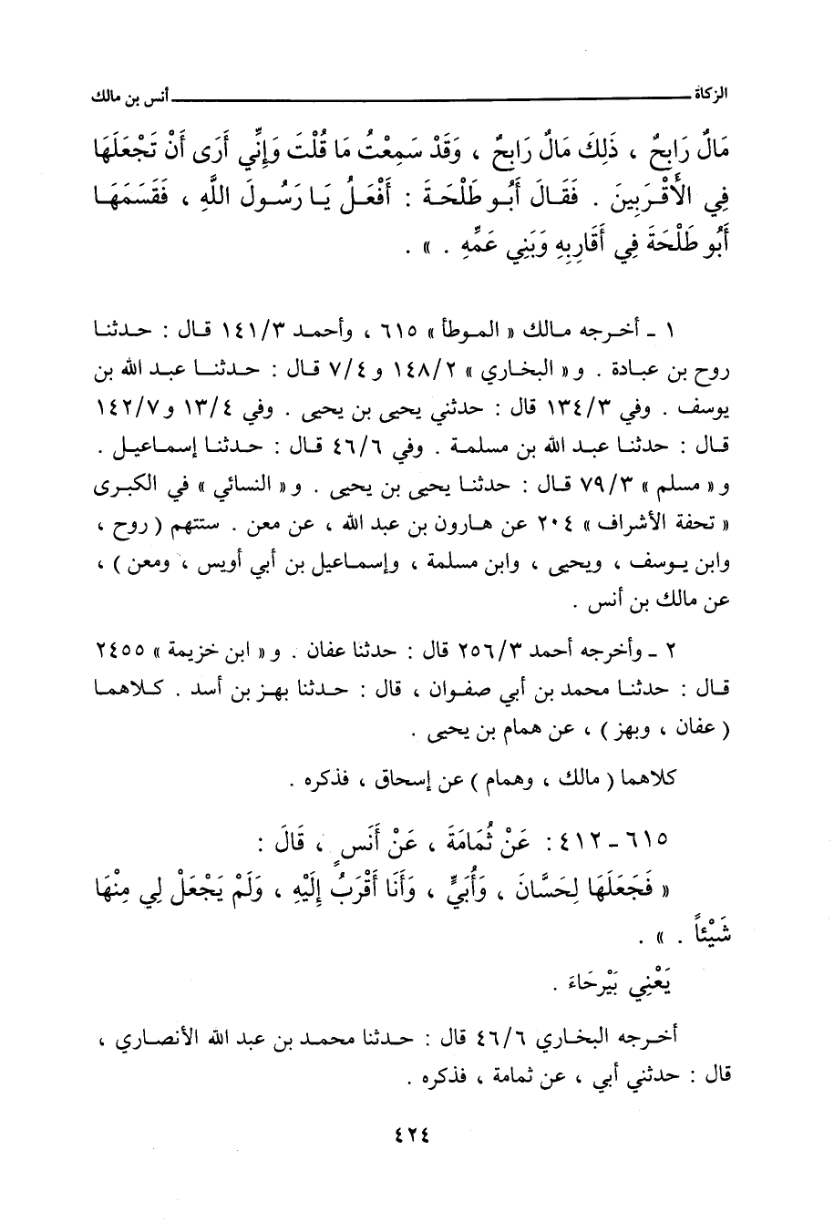 - وفي رواية: أَنَّ أَبَا طَلْحَةَ أَتَى النَّبِيَّ صلى الله عليه وسلم، وَهُوَ عَلَى الْمِنْبَرِ، فَقَالَ لِلنَّبِيِّ صلى الله عليه وسلم: مَاذَا تَرَى؟ نَزَلَتْ هَذِهِ الآيَةُ، قَالَ: إِنَّ اللَّهَ، عَزَّ وَجَلَّ، قَالَ: لَنْ تَنَالُوا الْبِرَّ حَتَّى تُنْفِقُوا مِمَّا تُحِبُّونَ)، وَإِنَّهُ لَيْسَ لِي مَالٌ أَحَبَّ إِلَيَّ مِنْ أَرْضِي بَيْرُحَاءَ، وَإِنِّي أَتَقَرَّبُ بِهَا إِلَى اللهِ، عَزَّ وَجَلَّ، قَالَ: فَقَالَ رَسُولُ اللهِ صلى الله عليه وسلم: بَخٍْ، بَخٍْ، بَيْرُحَاءَ خَيْرٌ رَابِحٌ، فَقَسَمَهَا بَيْنَهُمْ حَدَائِقَ.