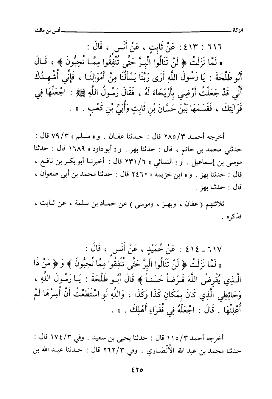 - أخرجه البُخَارِي، تَعْلِيقًا، (٢٧٥١ م) قال: وقال ثابتٌ، عن أَنَسٍ، قال النَّبِيُّ صلى الله عليه وسلم لأَبِي طَلْحَةَ: اجْعَلْهَا لِفُقَرَاءِ أَقَارِبِكَ، فَجَعَلَهَا لِحَسَّانَ، وَأُبَيِّ بْنِ كَعْبٍ.