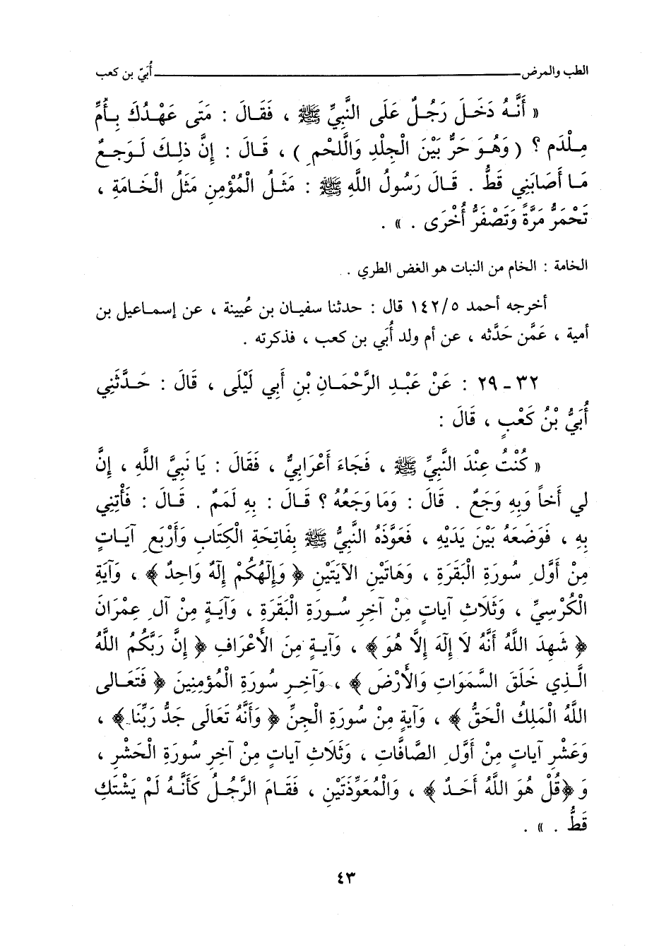 أَنَّهُ دَخَلَ رَجُلٌ عَلَى النَّبِيِّ صلى الله عليه وسلم، فَقَالَ: مَتَى عَهْدُكَ بِأُمِّ مِلْدَمٍ؟ (وَهُوَ حَرٌّ بَيْنَ الْجِلْدِ وَاللَّحْمِ) قَالَ: إِنَّ ذَلِكَ لَوَجَعٌ مَا أَصَابَنِي قَطُّ، قَالَ رَسُولُ اللهِ صلى الله عليه وسلم: مَثَلُ الْمُؤْمِنِ مَثَلُ الْخَامَةِ، تَحْمَرُّ مَرَّةً، وَتَصْفَرُّ أُخْرَى.