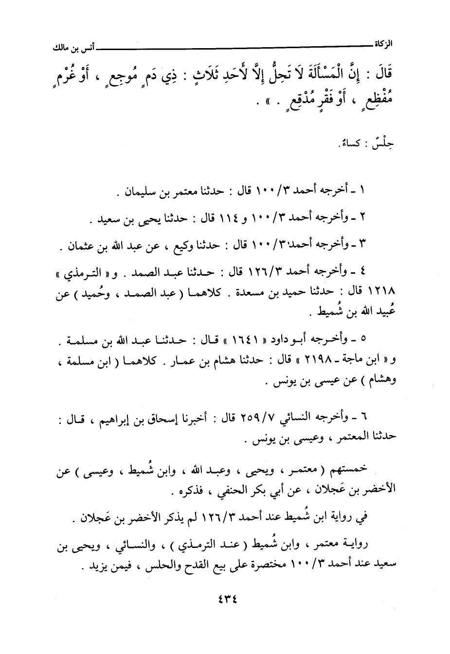 إِنَّ الْمَسْأَلَةَ لَا تَحِلُّ إِلَاّ لِثَلَاثَةٍ: لِذِي فَقْرٍ مُدْقِعٍ، أَوْ لِذِي غُرْمٍ مُفْظِعٍ، أَوْ لِذِي دَمٍ مُوجِعٍ.