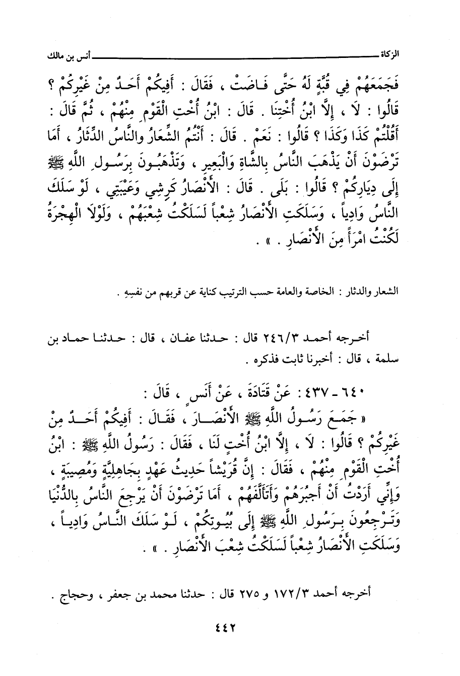 جَمَعَ رَسُولُ اللهِ صلى الله عليه وسلم الأَنْصَارَ، فَقَالَ: أَفِيكُمْ أَحَدٌ مِنْ غَيْرِكُمْ؟ قَالُوا: لَا، إِلَاّ ابْنَ أُخْتٍ لَنَا، فَقَالَ رَسُولُ اللهِ صلى الله عليه وسلم: ابْنُ أُخْتِ الْقَوْمِ مِنْهُمْ - قَالَ حَجَّاجٌ: أَوْ مِنْ أَنْفُسِهِمْ - فَقَالَ: إِنَّ قُرَيْشًا حَدِيثُ عَهْدٍ بِجَاهِلِيَّةٍ وَمُصِيبَةٍ، وَإِنِّي أَرَدْتُ أَنْ أَجْبُرَهُمْ وأَتَأَلَّفَهُمْ، أَمَا تَرْضَوْنَ أَنْ يَرْجِعَ النَّاسُ بِالدُّنْيَا، وَتَرْجِعُونَ بِرَسُولِ اللهِ إِلَى بُيُوتِكُمْ، لَوْ سَلَكَ النَّاسُ وَادِيًا، وَسَلَكَتِ الأَنْصَارُ شِعْبًا، لَسَلَكْتُ شِعْبَ الأَنْصَارِ.