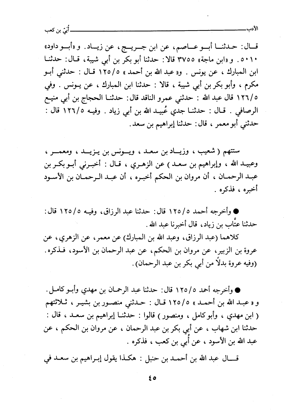 أربعتهم (يزيد، وابن مَهْدِي، وأبو كامل، ومَنْصُور) عن إبراهيم بن سَعْد، قال: حدَّثنا ابن شِهَاب، عن أَبي بَكْر بن عَبْد الرَّحْمان، عن مَرْوَان بن الحَكَم، عن عَبْد الله بن الأَسْوَد بن عَبْد يَغُوث، عن أُبَي بن كَعْب، أَنَّ رَسُولَ اللهِ صلى الله عليه وسلم قَالَ: