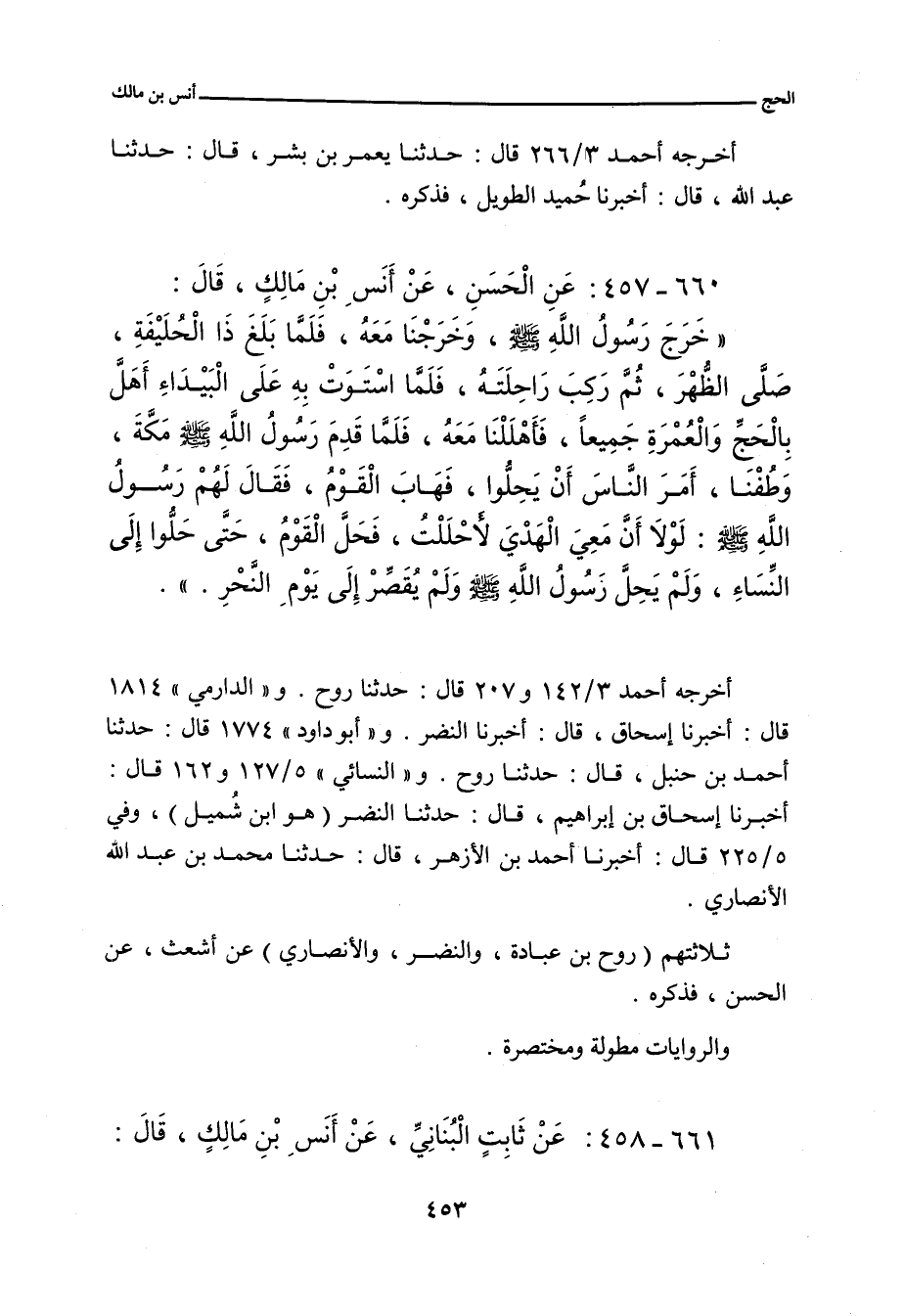 أخرجه أحمد ٣/ ١٤٢ (١٢٤٧٤) و ٣/ ٢٠٧ (١٣١٨٥) قال: حدَّثنا رَوْح. و"الدارِمِي" ١٨٠٧ قال: أخبرنا إِسْحَاق، قال: أخبرنا النَّضْر، هو ابن شُميل. و"أبو داود" ١٧٧٤ قال: حدَّثنا أحمد بن حَنْبَل، حدَّثنا رَوْح. و"النَّسائي" ٥/ ١٢٧ و ١٦٢، وفي "الكبرى" ٣٧٢١ قال: أخبرنا إِسْحَاق بن إبراهيم، قال: حدَّثنا النَّضْر، وهو ابن شُمَيْل. وفي ٥/ ٢٢٥ قال: أخبرنا أحمد بن الأَزْهَر، قال: حدَّثنا مُحَمد بن عَبْد الله الأَنْصَارِي.