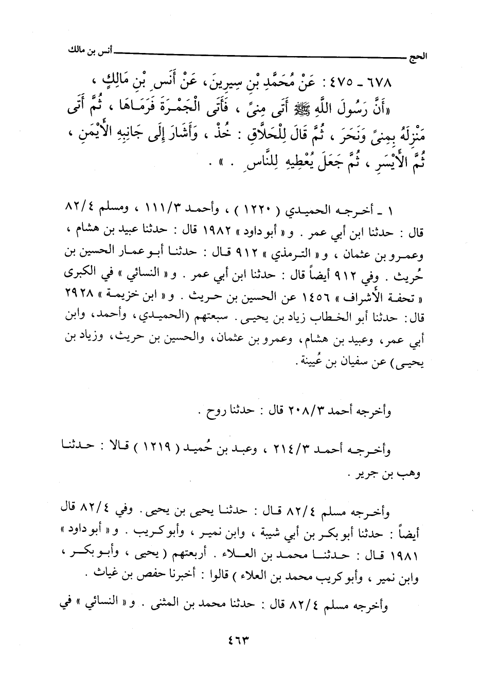 - وفي رواية: رَمَى رَسُولُ اللهِ صلى الله عليه وسلم الْجَمْرَةَ يَوْمَ النَّحْرِ، ثُمَّ أَمَرَ بِالْبُدْنِ فَنُحِرَتْ، وَالْحَلَاّقُ جَالِسٌ عِنْدَهُ، فَسَوَّى رَسُولُ اللهِ صلى الله عليه وسلم يَوْمَئِذِ شَعَْرَهُ بِيَدِهِ، ثُمَّ قَبَضَ رَسُولُ اللهِ صلى الله عليه وسلم عَلَى شِقِّ جَانِبِهِ الأَيْمَنِ، عَلَى شَعَْرِهِ، ثُمَّ قَالَ لِلْحَلَاّقِ: احْلِقْ، فَحَلَقَ، فَقَسَمَ رَسُولُ اللهِ صلى الله عليه وسلم شَعَْرَهُ يَوْمَئِذٍ بَيْنَ مَنْ حَضَرَهُ مِنَ النَّاسِ، الشَّعَْرَةَ وَالشَّعَْرَتَيْنِ، ثُمَّ قَبَضَ بِيَدِهِ عَلَى جَانِبِ شِقِّهِ الأَيْسَرِ، عَلَى شَعَْرِهِ، ثُمَّ قَالَ لِلْحَلَاّقِ: احْلِقْ، فَحَلَقَ، فَدَعَا أَبَا طَلْحَةَ الأَنْصَارِيَّ فَدَفَعَهُ إِلَيْهِ.