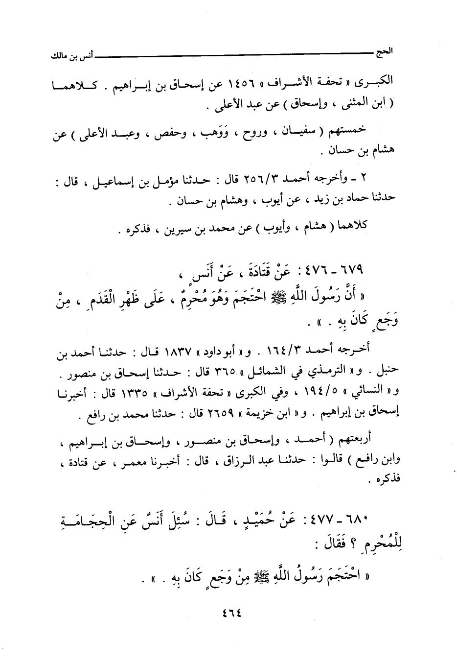 - وفي رواية: أَنَّ رَسُولَ اللهِ صلى الله عليه وسلم احْتَجَمَ، وَهُوَ مُحْرِمٌ، عَلَى ظَهْرِ الْقَدَمِ، مِنْ وَثْءٍ كَانَ بِهِ.