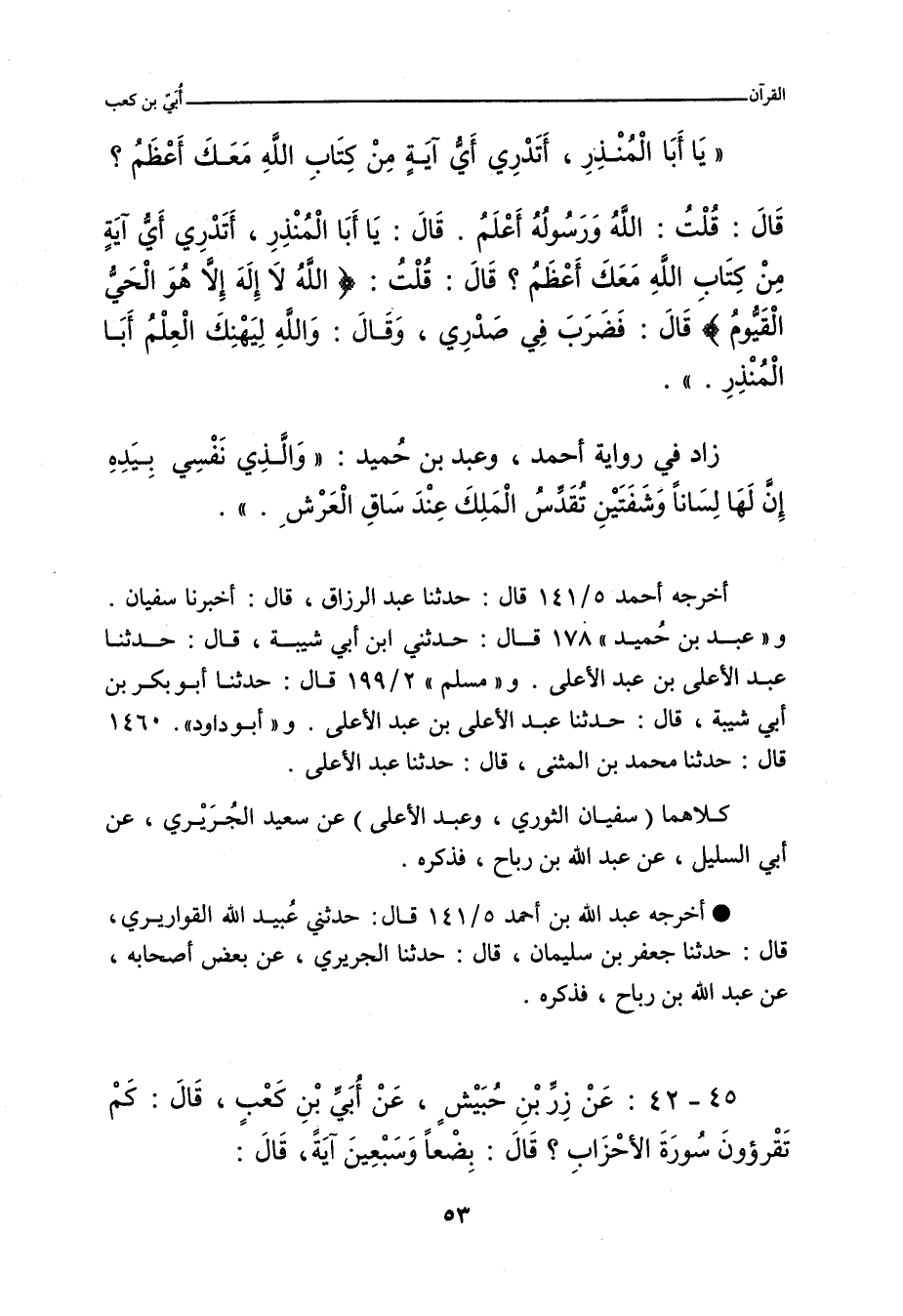٤٥ - عَنْ زِرِّ بْنِ حُبَيْشٍ، قَالَ: قَالَ أُبَيُّ بْنُ كَعْبٍ: كَأَيِّنْ تَقْرَؤونُ سُورَةَ الأَحْزَابِ؟ قَالَ: قُلْتُ بِضْعًا وَثَمَانِينَ آيَةً. قَالَ: