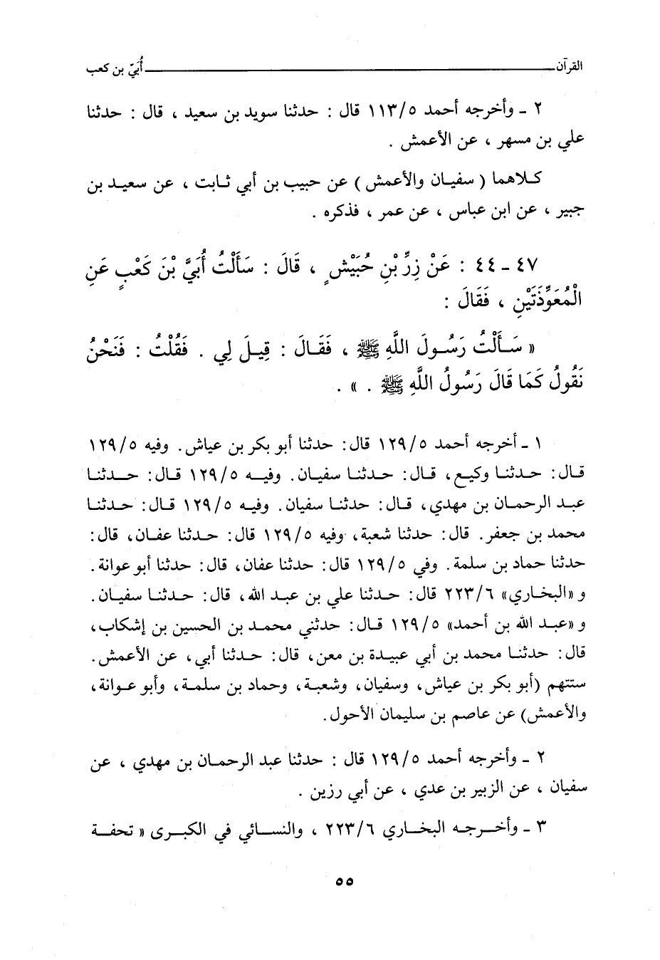 ٤٧ - عَنْ زِرِّ بْنِ حُبَيْشٍ، قَالَ: سَأَلْتُ أُبَيَّ بْنَ كَعْبٍ عَنِ الْمُعَوِّذَتَيْنِ؟ فَقُلْتُ: يَا أَبَا الْمُنْذِرِ، إِنَّ أَخَاكَ ابْنَ مَسْعُودٍ يَحُكُّهُمَا مِنَ الْمُصْحَفِ، قَالَ: