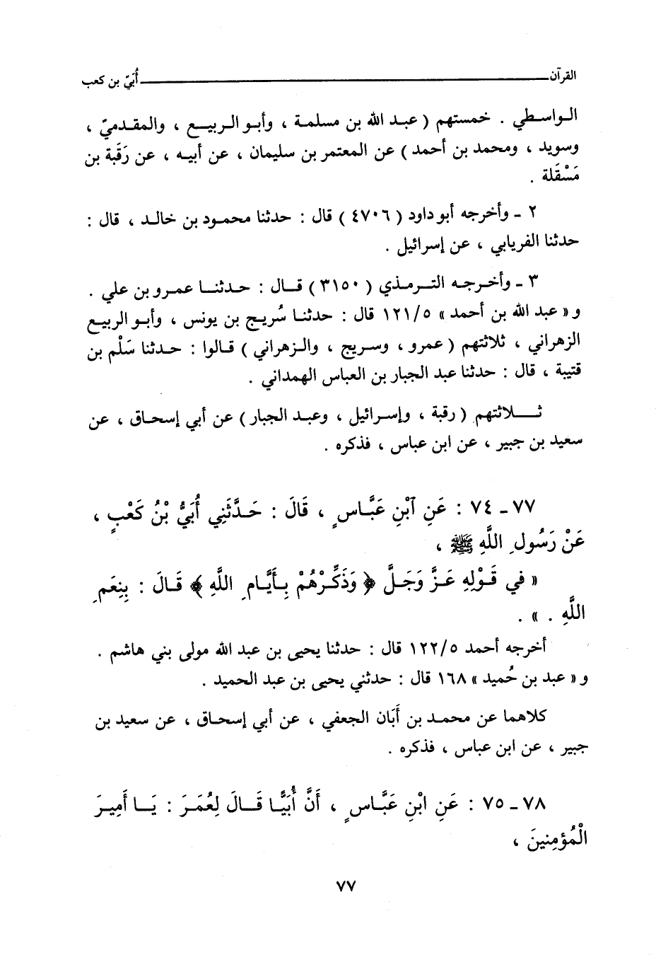 ٧٧ - عَنِ ابْنِ عَبَّاسٍ، قَالَ: حَدَّثَنِي أُبَيُّ بْنُ كَعْبٍ، عَنْ رسول الله صلى الله عليه وسلم؛