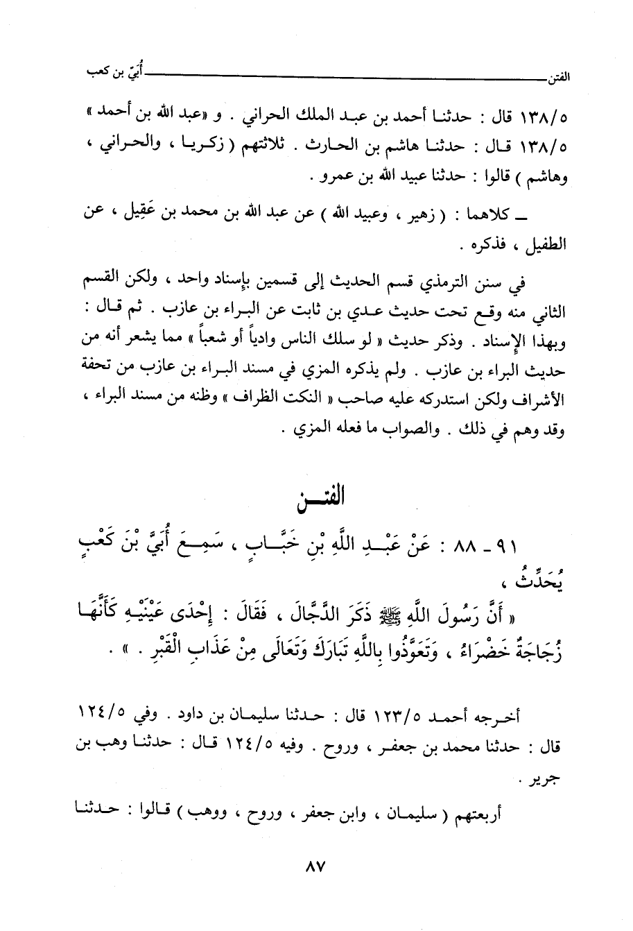 (ح) وحدثنا أحمد بن عَبْد الملك الحَرَّانِي , حدَّثنا عُبَيْد الله بن عَمْرو. والتِّرْمِذِيّ" ٣٨٩٩ قال: حدَّثنا مُحَمد بن بَشَّار , حدَّثنا أبو عامر , عن زُهَيْر بن مُحَمد. و"عَبْد الله بن أحمد" ٥/ ١٣٨ (٢١٥٧٤) قال: حدَّثنا هاشم بن الحارث , حدثنا عُبَيْد الله ابن عَمْرو. وفي (٢١٥٧٧) قال: حدَّثنا مُحَمد بن أَبي بَكْر المُقَدَّمِي، حدَّثنا أبو حُذَيْفَة مُوسَى، عن زُهَيْر بن مُحَمد.