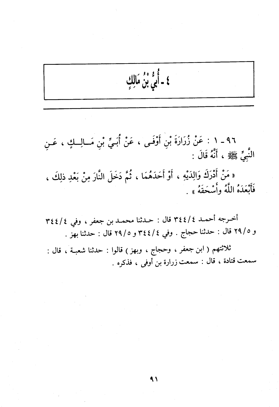 ٩٦ - عَنْ زُرَارَةَ بْنِ أَوْفَى، عَنْ أُبَيِّ بْنِ مَالِكٍ، عَنِ النَّبِيِّ صلى الله عليه وسلم، أَنَّهُ قَالَ:
