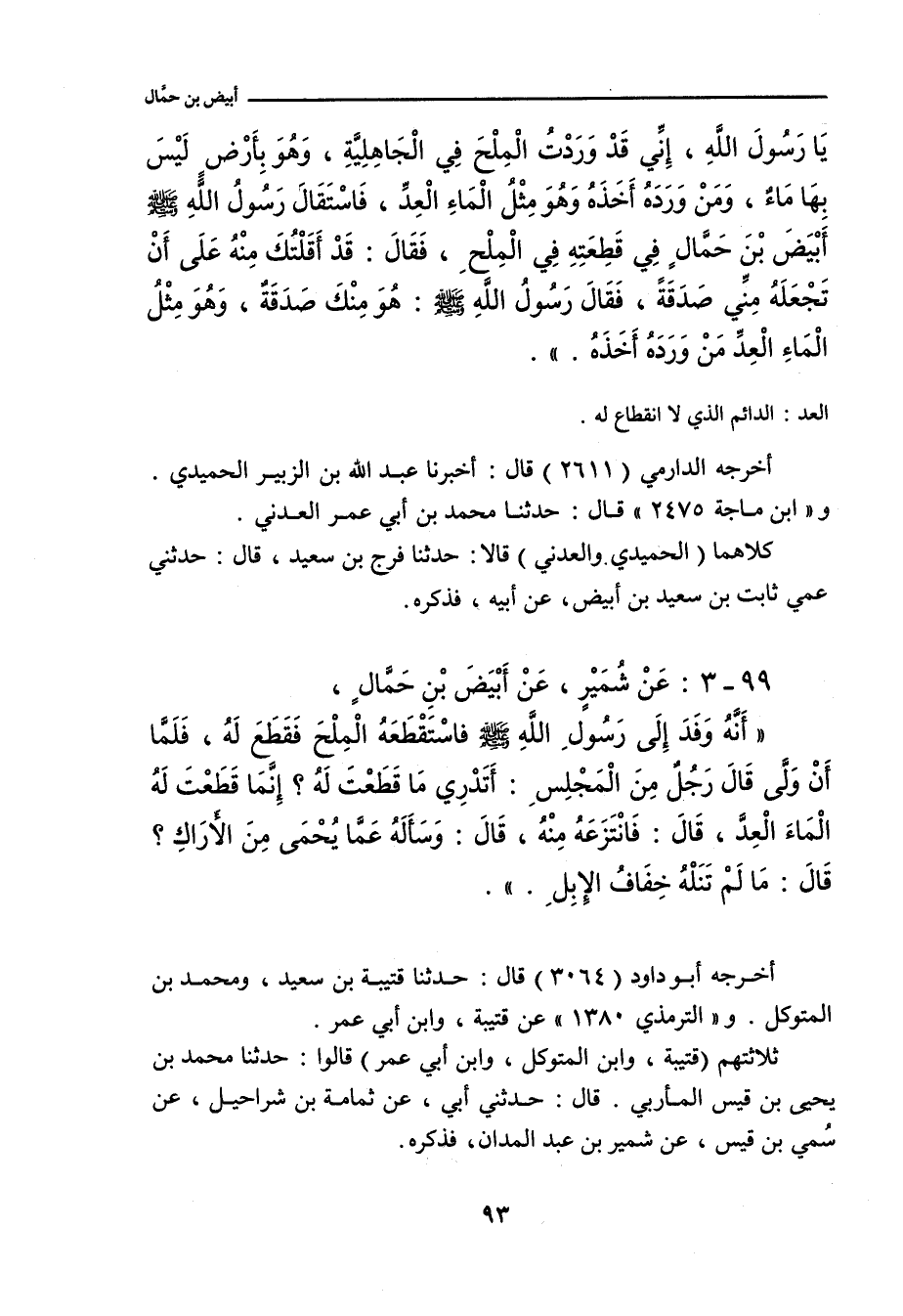 يَا رَسُولَ اللهِ، إِنِّي قَدْ وَرَدْتُ الْمِلْحَ فِي الْجَاهِلِيَّةِ، وَهُوَ بِأَرْضٍ لَيْسَ بِهَا مَاءٌ، وَمَنْ وَرَدَهُ أَخَذَهُ، وَهُوَ مِثْلُ الْمَاءِ الْعِدِّ، فَاسْتَقَالَ رَسُولُ اللهِ صلى الله عليه وسلم أَبْيَضَ بْنَ حَمَّالٍ فِي قَطِيعَتِهِ فِي الْمِلْحِ، فَقَالَ: قَدْ أَقَلْتُكَ مِنْهُ عَلَى أَنْ تَجْعَلَهُ مِنِّي صَدَقَةً، فَقَالَ رَسُولُ اللهِ صلى الله عليه وسلم: هُوَ مِنْكَ صَدَقَةٌ، وَهُوَ مِثْلُ الْمَاءِ الْعِدِّ، مَنْ وَرَدَهُ أَخَذَهُ.