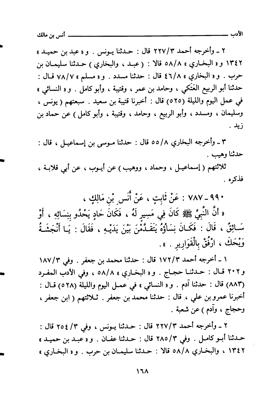 - وفي رواية: أَنَّ النَّبِيَّ صلى الله عليه وسلم كَانَ لَهُ حَادٍ جَيِّدُ الْحُدَاءِ، وَكَانَ حَادِيَ الرِّجَالِ، وَكَانَ أَنْجَشَةُ يَحْدُو بِأَزْوَاجِ النَّبِيِّ صلى الله عليه وسلم، فَلَمَّا حَدَا أَعْنَقَتِ الإِبِلُ، فَقَالَ النَّبِيُّ صلى الله عليه وسلم: وَيْحَكَ، يَا أَنْجَشَةُ، رُوَيْدًا سَوْقَكَ بِالْقَوَارِيرِ.