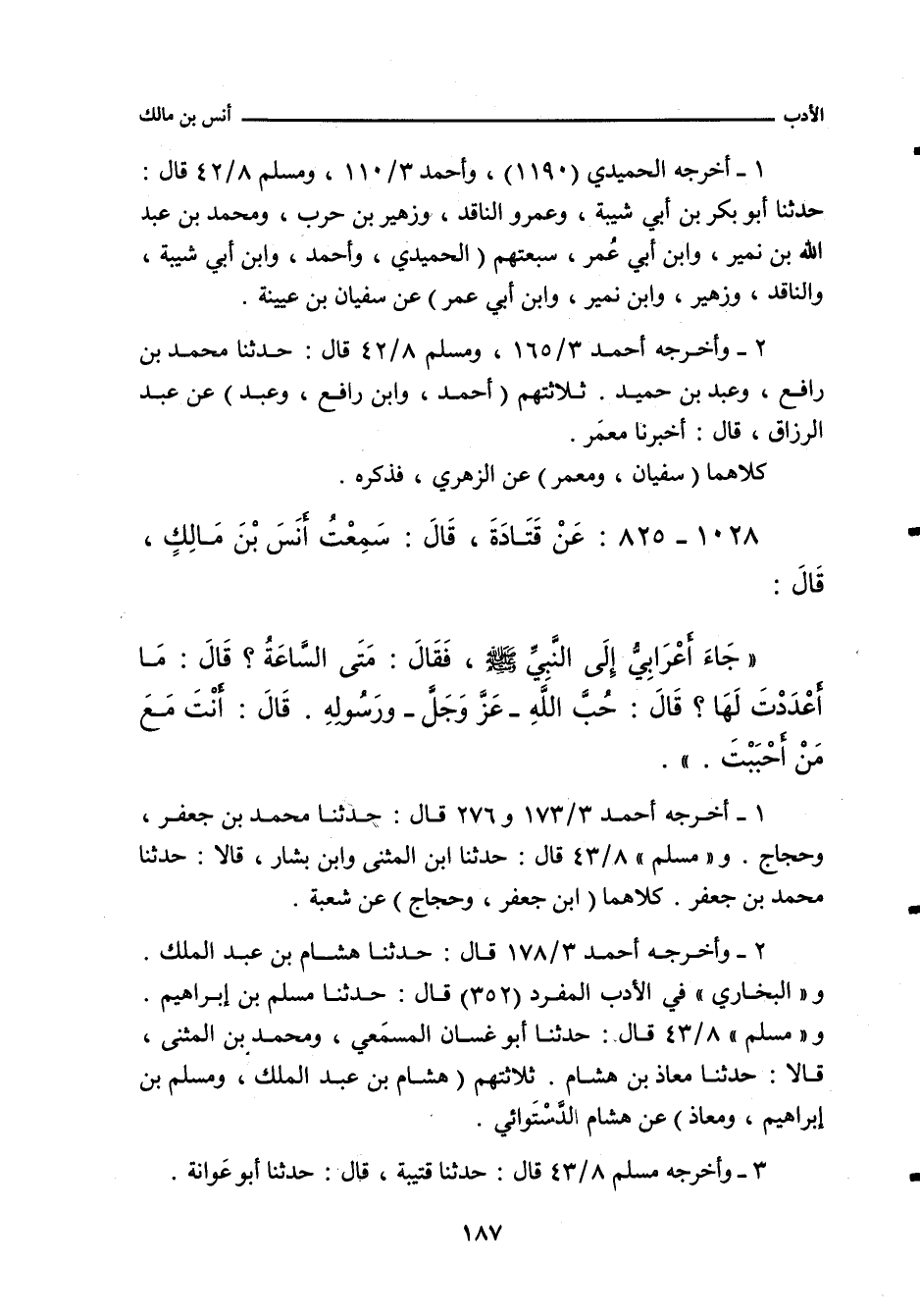 - وفي رواية: أَنَّ رَجُلاً مِنْ أَهْلِ الْبَادِيَةِ أَتَى النَّبِيَّ صلى الله عليه وسلم، فَقَالَ: يَا رَسُولَ اللهِ، مَتَى السَّاعَةُ قَائِمَةٌ؟ قَالَ: وَيْلَكَ، وَمَا أَعْدَدْتَ لَهَا؟ قَالَ: مَا أَعْدَدْتُ لَهَا إِلَاّ أَنِّي أُحِبُّ اللهَ وَرَسُولَهُ، قَالَ: إِنَّكَ مَعَ مَنْ أَحْبَبْتَ، فَقُلْنَا: وَنَحْنُ كَذَلِكَ؟ قَالَ: نَعَمْ، فَفَرِحْنَا يَوْمَئِذٍ فَرَحًا شَدِيدًا، فَمَرَّ غُلَامٌ لِلْمُغِيرَةِ، وَكَانَ مِنْ أَقْرَانِي، فَقَالَ: إِنْ أُخِّرَ هَذَا فَلَنْ يُدْرِكَهُ الْهَرَمُ، حَتَّى تَقُومَ السَّاعَةُ.