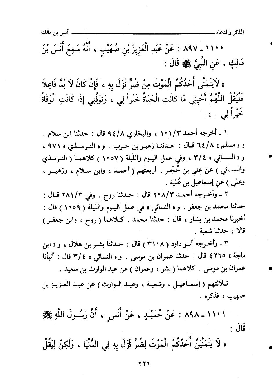 - رواية عَبْد الوارث، عند أَبي داود: لَا يَدْعُوَنَّ أَحَدُكُمْ بِالْمَوْتِ لِضُرٍّ نَزَلَ بِهِ، وَلَكِنْ لِيَقُلْ: اللَّهُمَّ أَحْيِنِي مَا كَانَتِ الْحَيَاةُ خَيْرًا لِي، وَتَوَفَّنِي إِذَا كَانَتِ الْوَفَاةُ خَيْرًا لِي.