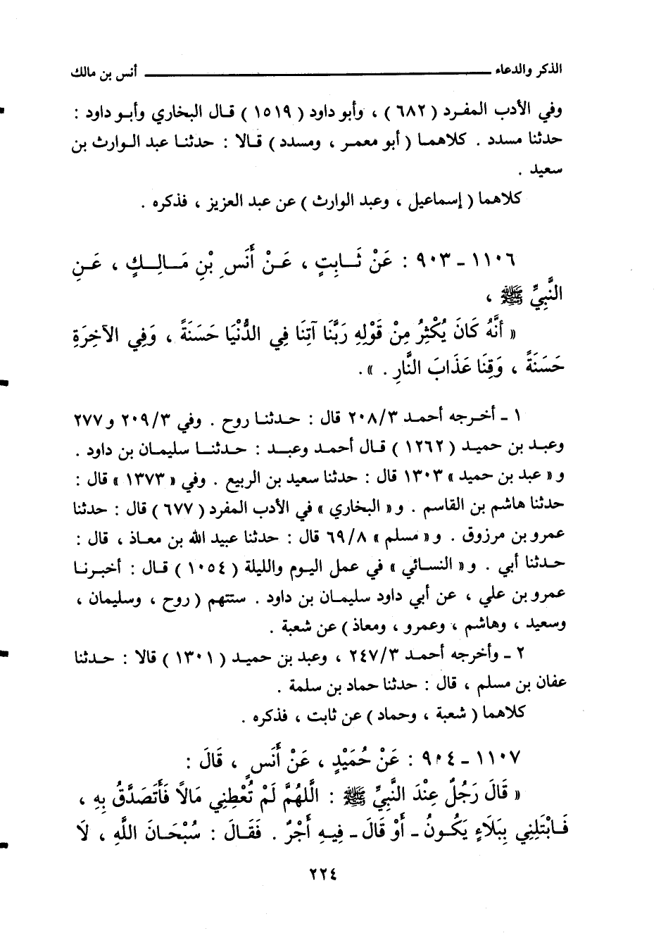 - وفي رواية: أَنَّهُمْ قَالُوا لأَنَسِ بْنِ مَالِكٍ: ادْعُ اللهَ لَنَا، فَقَالَ: اللَّهُمَّ آتِنَا فِي الدُّنْيَا حَسَنَةً، وَفِي الآخِرَةِ حَسَنَةً، وَقِنَا عَذَابَ النَّارِ، قَالُوا: زِدْنَا، فَأَعَادَهَا , قَالُوا: زِدْنَا، فَأَعَادَهَا، فَقَالُوا: زِدْنَا، فَقَالَ: مَا تُرِيدُونَ؟ سَأَلْتُ لَكُمْ خَيْرَ الدُّنْيَا وَالآخِرَةِ.