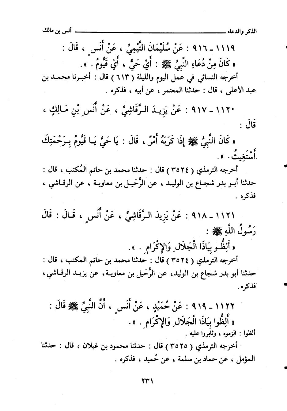 ١١٢١ - عَنْ يَزِيدَ الرَّقَاشِيِّ، عَنْ أَنَسِ بْنِ مَالِكٍ، قَالَ: قَالَ رَسُولُ اللهِ صلى الله عليه وسلم: