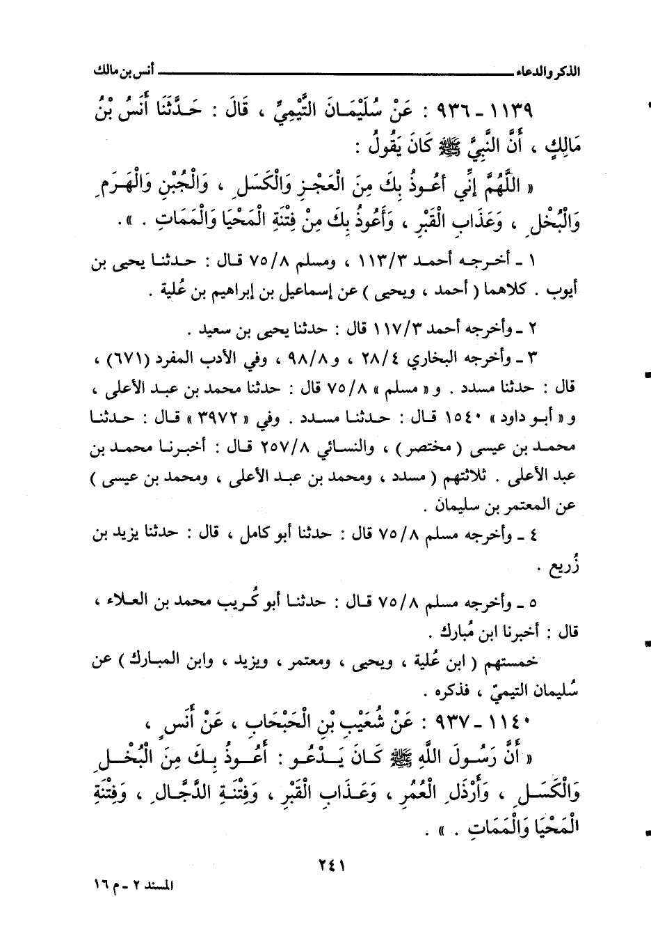 - وفي رواية: أَنَّ النَّبِيَّ صلى الله عليه وسلم كَانَ يَقُولُ: اللَّهُمَّ إِنِّي أَعُوذُ بِكَ مِنَ الْعَجْزِ وَالْكَسَلِ، وَالْهَرَمِ وَالْبُخْلِ، وَالْجُبْنِ وَعَذَابِ الْقَبْرِ، وَشَرِّ الْمَسِيحِ الدَّجَّالِ.