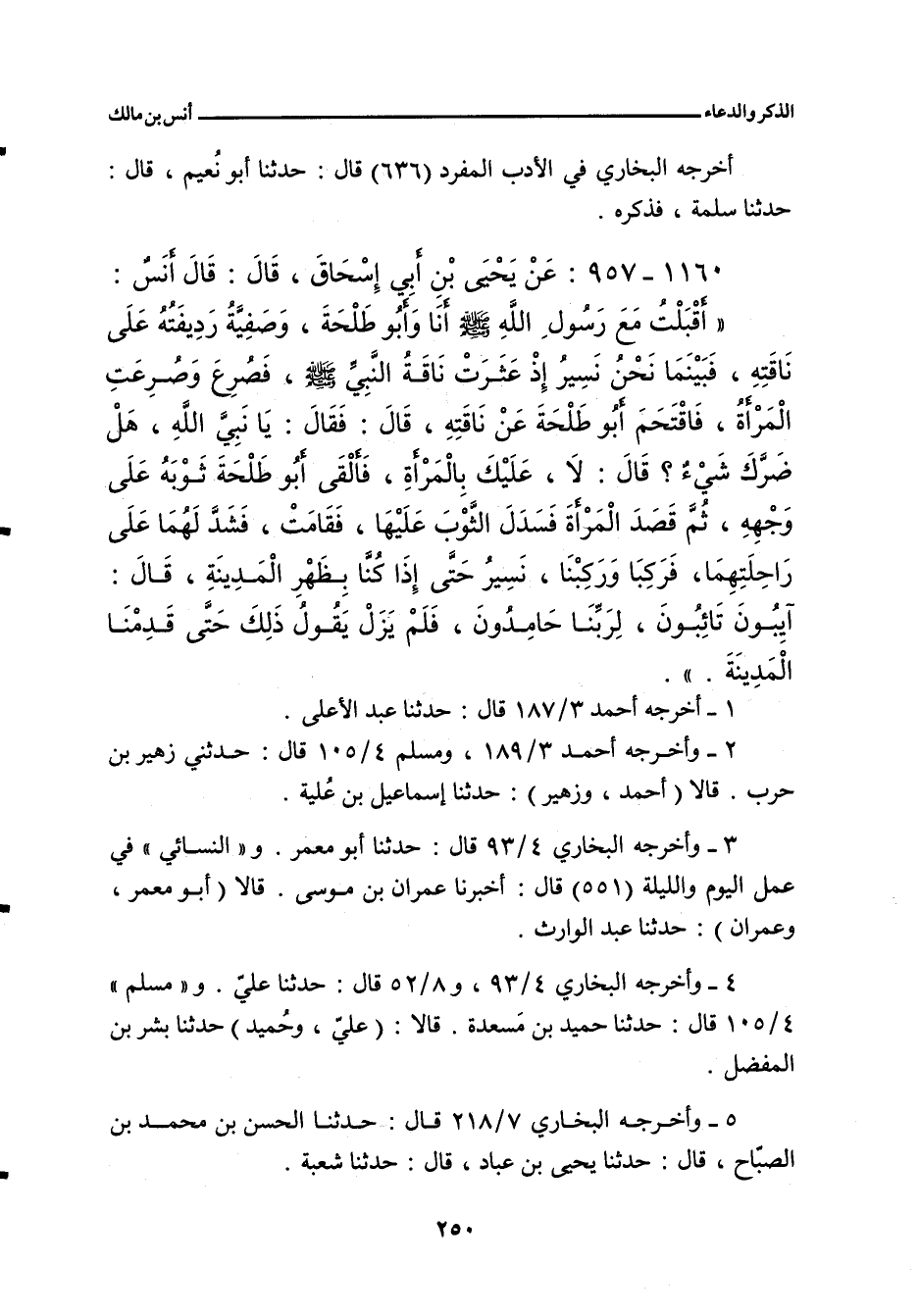 - وفي رواية: أَقْبَلْنَا مَعَ رَسُولِ اللهِ صلى الله عليه وسلم مِنْ خَيْبَرَ، وَإِنِّي لَرَدِيفُ أَبِي طَلْحَةَ، وَهُْوَ يَسِيرُ، وَبَعْضُ نِسَاءِ رَسُولِ اللهِ صلى الله عليه وسلم رَدِيفُ رَسُولِ اللهِ صلى الله عليه وسلم، إِذْ عَثَرَتِ النَّاقَةُ، فَقُلْتُ: الْمَرْأَةَ، فَنَزَلْتُ، فَقَالَ رَسُولُ اللهِ صلى الله عليه وسلم: إِنَّهَا أُمُّكُمْ، فَشَدَدْتُ الرَّحْلَ، وَرَكِبَ رَسُولُ اللهِ صلى الله عليه وسلم، فَلَمَّا دَنَا، أَوْ رَأَى الْمَدِينَةَ، قَالَ: آيِبُونَ، تَائِبُونَ، عَابِدُونَ، لِرَبِّنَا حَامِدُونَ.