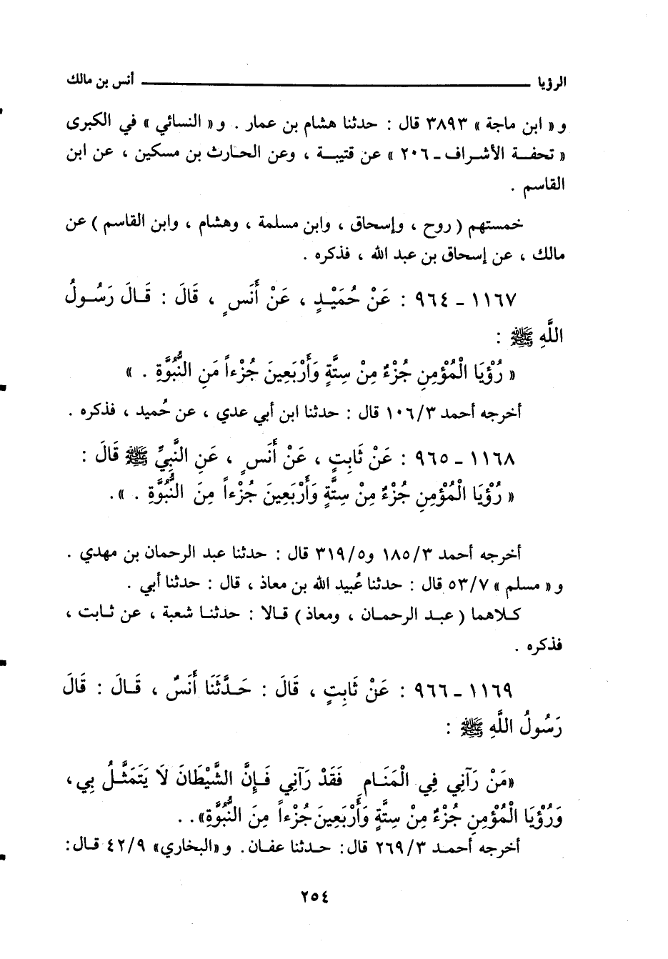 - لفظ مُعَلَّى بن أَسَد: قَالَ النَّبِيُّ صلى الله عليه وسلم: مَنْ رَآنِي فِي الْمَنَامِ فَقَدْ رَآنِي، فَإِنَّ الشَّيْطَانَ لَا يَتَخَيَّلُ بِي، وَرُؤْيَا الْمُؤْمِنِ جُزْءٌ مِنْ سِتَّةٍ وَأَرْبَعِينَ جُزْءًا مِنَ النُّبُوَّةِ.