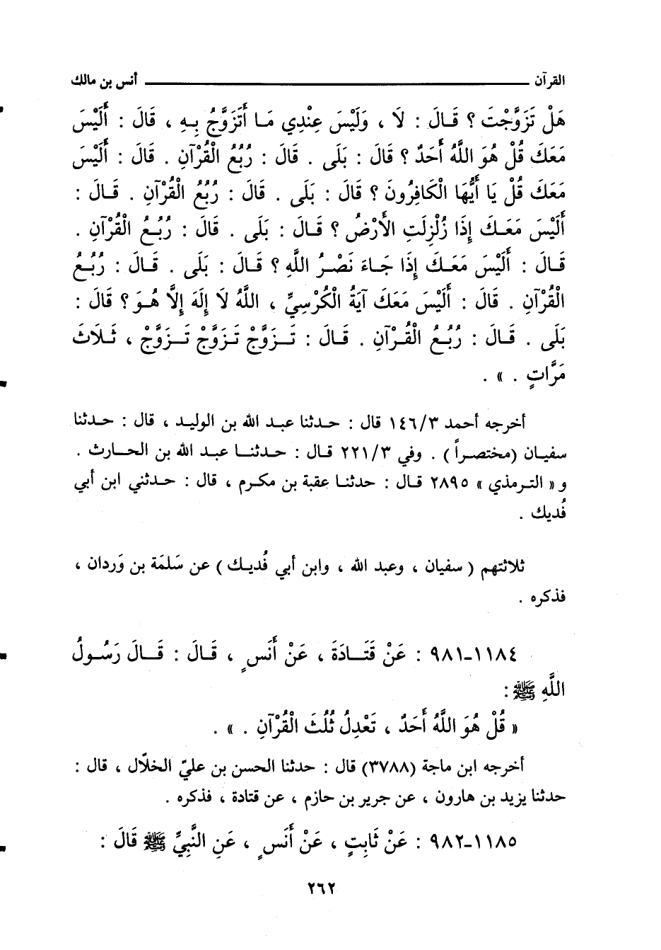 هَلْ تَزَوَّجْتَ؟ قَالَ: لَا، وَلَيْسَ عِنْدِي مَا أَتَزَوَّجُ بِهِ، قَالَ: أَلَيْسَ مَعَكَ (قُلْ هُوَ اللَّهُ أَحَدٌ)؟ قَالَ: بَلَى، قَالَ: رُبُعُ الْقُرْآنِ، قَالَ: أَلَيْسَ مَعَكَ (قُلْ يَا أَيُّهَا الْكَافِرُونَ)؟ قَالَ: بَلَى، قَالَ: رُبُعُ الْقُرْآنِ، قَالَ: أَلَيْسَ مَعَكَ (إِذَا زُلْزِلَتِ الأَرْضُ)؟ قَالَ: بَلَى، قَالَ: رُبُعُ الْقُرْآنِ، قَالَ: أَلَيْسَ مَعَكَ (إِذَا جَاءَ نَصْرُ اللهِ)؟ قَالَ: بَلَى، قَالَ: رُبُعُ الْقُرْآنِ، قَالَ: أَلَيْسَ مَعَكَ آيَةُ الْكُرْسِيِّ (اللَّهُ لَا إِلَهَ إِلَاّ هُوَ)؟ قَالَ: بَلَى، قَالَ: رُبُعُ الْقُرْآنِ، قَالَ: تَزَوَّجْ. تَزَوَّجْ. تَزَوَّجْ - ثَلَاثَ مَرَّاتٍ -.