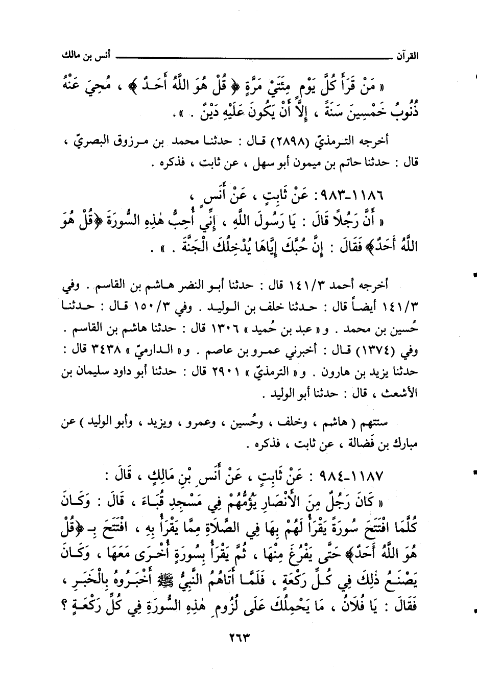 - وفي رواية: قِيلَ: يَا رَسُولَ اللهِ، إِنَّ هَا هُنَا رَجُلاً لَا يُصَلِّي صَلَاةً، إِلَاّ قَرَأَ فِيهَا: قُلْ هُوَ اللَّهُ أَحَدٌ) مِنْهَا مَا يُفْرِدُهَا، وَمِنْهَا مَا يَقْرَأُهَا مَعَ سُورَةٍ، فَقَالَ لَهُ النَّبِيُّ صلى الله عليه وسلم: وَمَا تُرِيدُ إِلَى هَذَا؟ قَالَ: يَا رَسُولَ اللهِ، إِنِّي أُحِبُّهَا، قَالَ: حُبُّهَا إِذًا أَدْخَلَكَ الْجَنَّةَ.