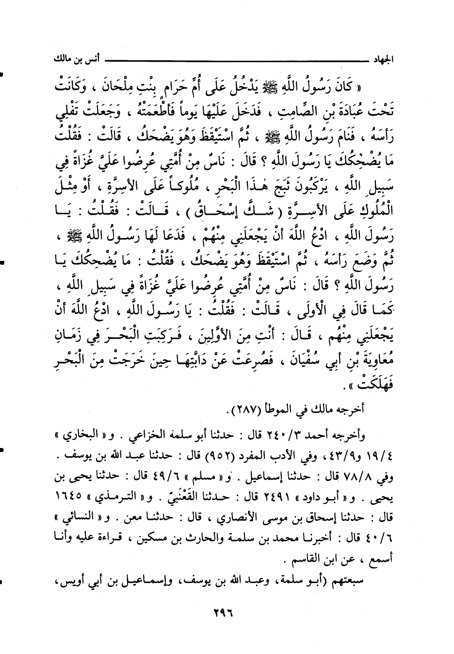 كَانَ رَسُولُ اللهِ صلى الله عليه وسلم يَدْخُلُ عَلَى أُمِّ حَرَامٍ بِنْتِ مِلْحَانَ، وَكَانَتْ تَحْتَ عُبَادَةَ بْنِ الصَّامِتِ، فَدَخَلَ عَلَيْهَا يَوْمًا فَأَطْعَمَتْهُ، وَجَعَلَتْ تَفْلِي رَأْسَهُ، فَنَامَ رَسُولُ اللهِ صلى الله عليه وسلم، ثُمَّ اسْتَيْقَظَ وَهُوَ يَضْحَكُ، قَالَتْ: فَقُلْتُ: مَا يُضْحِكُكَ يَا رَسُولَ اللهِ؟ قَالَ: نَاسٌ مِنْ أُمَّتِي، عُرِضُوا عَلَيَّ، غُزَاةً فِي سَبِيلِ اللهِ، يَرْكَبُونَ ثَبَجَ هَذَا الْبَحْرِ، مُلُوكًا عَلَى الأَسِرَّةِ، أَوْ مِثْلَ الْمُلُوكِ عَلَى الأَسِرَّةِ - شَكَّ إِسْحَاقُ - قَالَتْ: فَقُلْتُ: يَا رَسُولَ اللهِ، ادْعُ اللهَ أَنْ يَجْعَلَنِي مِنْهُمْ، فَدَعَا لَهَا رَسُولُ اللهِ صلى الله عليه وسلم، ثُمَّ وَضَعَ رَأْسَهُ، ثُمَّ اسْتَيْقَظَ وَهُوَ يَضْحَكُ، فَقُلْتُ: مَا يُضْحِكُكَ يَا رَسُولَ اللهِ؟ قَالَ: نَاسٌ مِنْ أُمَّتِي، عُرِضُوا عَلَيَّ، غُزَاةً فِي سَبِيلِ اللهِ - كَمَا قَالَ فِي الأُولَى - قَالَتْ: فَقُلْتُ: يَا رَسُولَ اللهِ، ادْعُ اللهَ أَنْ يَجْعَلَنِي مِنْهُمْ، قَالَ: أَنْتِ مِنَ الأَوَّلِينَ.