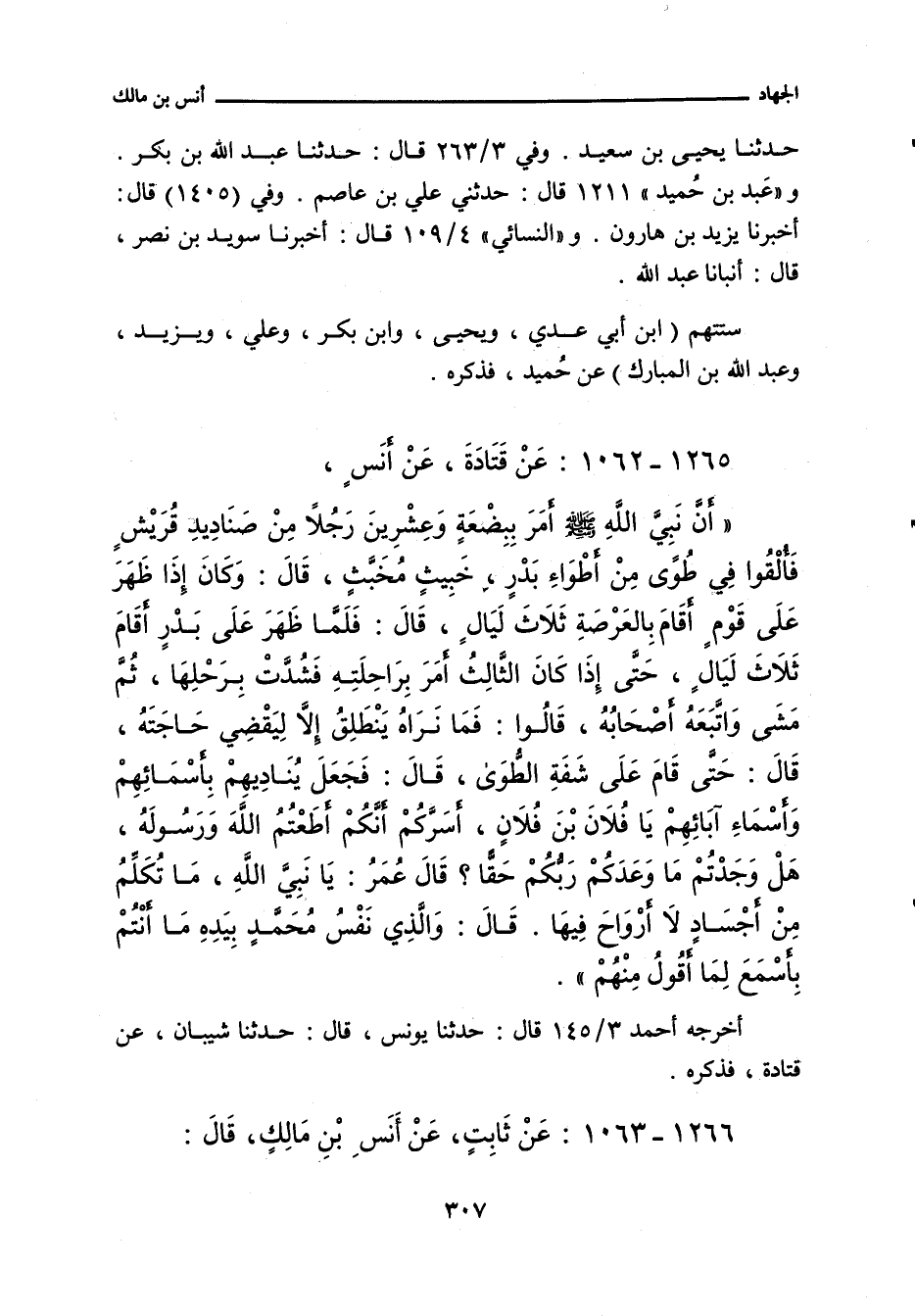 أَنَّ نَبِيَّ اللهِ صلى الله عليه وسلم أَمَرَ بِبِضْعَةٍ وَعِشْرِينَ رَجُلاً، مِنْ صَنَادِيدِ قُرَيْشٍ، فَأُلْقُوا فِي طُوًى مِنْ أَطْوَاءِ بَدْرٍ، خَبِيثٍ مُخْبِثٍ، قَالَ: وَكَانَ إِذَا ظَهَرَ عَلَى قَوْمٍ أَقَامَ بِالْعَرْصَةِ ثَلَاثَ لَيَالٍ، قَالَ: فَلَمَّا ظَهَرَ عَلَى أَهْلِ بَدْرٍ، أَقَامَ ثَلَاثَ لَيَالٍ، حَتَّى إِذَا كَانَ الْيَوْمُ الثَّالِثُ، أَمَرَ بِرَاحِلَتِهِ فَشُدَّتْ بِرَحْلِهَا، ثُمَّ مَشَى وَاتَّبَعَهُ أَصْحَابُهُ، قَالَ: فَمَا نَرَاهُ يَنْطَلِقُ إِلَاّ لِيَقْضِيَ حَاجَتَهُ، قَالَ: حَتَّى قَامَ عَلَى شَفَةِ الطُّوَى، قَالَ: فَجَعَلَ يُنَادِيهِمْ بِأَسْمَائِهِمْ، وَأَسْمَاءِ آبَائِهِمْ: يَا فُلَانُ بْنَ فُلَانٍ، أَسَرَّكُمْ أَنَّكُمْ أَطَعْتُمُ اللهَ وَرَسُولَهُ؟ هَلْ وَجَدْتُمْ مَا وَعَدَكُمْ رَبُّكُمْ حَقًّا؟ قَالَ عُمَرُ: يَا نَبِيَّ اللهِ، مَا تُكَلِّمُ مِنْ أَجْسَادٍ لَا أَرْوَاحَ فِيهَا؟ قَالَ: وَالَّذِي نَفْسُ مُحَمَّدٍ بِيَدِهِ، مَا أَنْتُمْ بِأَسْمَعَ لِمَا أَقُولُ مِنْهُمْ.