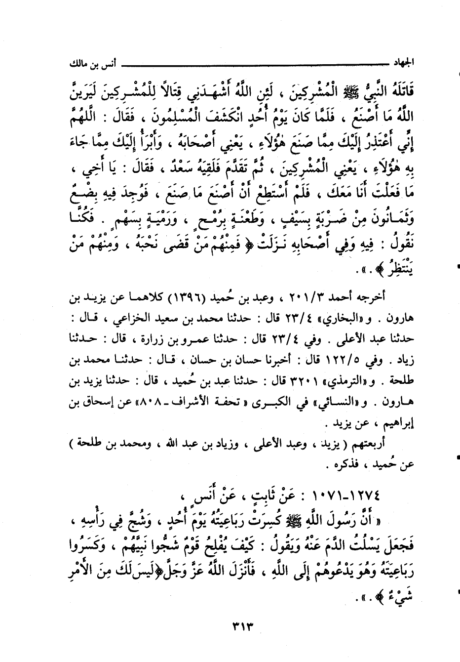 قَاتَلْتَ الْمُشْرِكِينَ، لَئِنِ اللَّهُ أَشْهَدَنِي قِتَالَ الْمُشْرِكِينَ لَيَرَيَنَّ اللَّهُ مَا أَصْنَعُ، فَلَمَّا كَانَ يَوْمُ أُحُدٍ، وَانْكَشَفَ الْمُسْلِمُونَ، قَالَ: اللَّهُمَّ إِنِّي أَعْتَذِرُ إِلَيْكَ مِمَّا صَنَعَ هَؤُلَاءِ، يَعْنِي أَصْحَابَهُ، وَأَبْرَأُ إِلَيْكَ مِمَّا صَنَعَ هَؤُلَاءِ، يَعْنِي الْمُشْرِكِينَ، ثُمَّ تَقَدَّمَ، فَاسْتَقْبَلَهُ سَعْدُ بْنُ مُعَاذٍ، فَقَالَ: يَا سَعْدُ بْنَ مُعَاذٍ، الْجَنَّةَ، وَرَبِّ النَّضْرِ، إِنِّي أَجِدُ رِيحَهَا مِنْ دُونِ أُحُدٍ، قَالَ سَعْدٌ: فَمَا اسْتَطَعْتُ يَا رَسُولَ اللهِ مَا صَنَعَ، قَالَ أَنَسٌ: فَوَجَدْنَا بِهِ بِضْعًا وَثَمَانِينَ ضَرْبَةً بِالسَّيْفِ، أَوْ طَعْنَةً بِرُمْحٍ، أَوْ رَمْيَةً بِسَهْمٍ، وَوَجَدْنَاهُ قَدْ قُتِلَ، وَقَدْ مَثَّلَ بِهِ الْمُشْرِكُونَ، فَمَا عَرَفَهُ أَحَدٌ إِلَاّ أُخْتُهُ بِبَنَانِهِ، قَالَ أَنَسٌ: كُنَّا نُرَى، أَوْ نَظُنُّ، أَنَّ هَذِهِ الآيَةَ نَزَلَتْ فِيهِ وَفِي أَشْبَاهِهِ: مِنَ الْمُؤْمِنِينَ رِجَالٌ صَدَقُوا مَا عَاهَدُوا اللهَ عَلَيْهِ) إِلَى آخِرِ الآيَةِ.