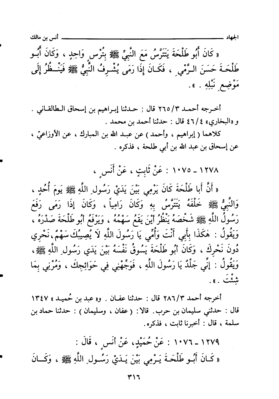 أَنَّ أَبَا طَلْحَةَ كَانَ يَرْمِي بَيْنَ يَدَيْ رَسُولِ اللهِ صلى الله عليه وسلم يَوْمَ أُحُدٍ، وَالنَّبِيُّ صلى الله عليه وسلم خَلْفَهُ يَتَتَرَّسُ بِهِ، وَكَانَ رَامِيًا، وَكَانَ إِذَا رَمَى رَفَعَ رَسُولُ اللهِ صلى الله عليه وسلم شَخْصَهُ يَنْظُرُ أَيْنَ يَقَعُ سَهْمُهُ، وَيَرْفَعُ أَبُو طَلْحَةَ صَدْرَهُ، وَيَقُولُ: هَكَذَا بِأَبِي أَنْتَ وَأُمِّي، يَا رَسُولَ اللهِ، لَا يُصِيبُكَ سَهْمٌ، نَحْرِي دُونَ نَحْرِكَ، وَكَانَ أَبُو طَلْحَةَ يَسُوقُ نَفْسَهُ بَيْنَ يَدَيْ رَسُولِ اللهِ صلى الله عليه وسلم، وَيَقُولُ: إِنِّي جَلْدٌ يَا رَسُولَ اللهِ، فَوَجِّهْنِي فِي حَوَائِجِكَ، وَمُرْنِي بِمَا شِئْتَ.