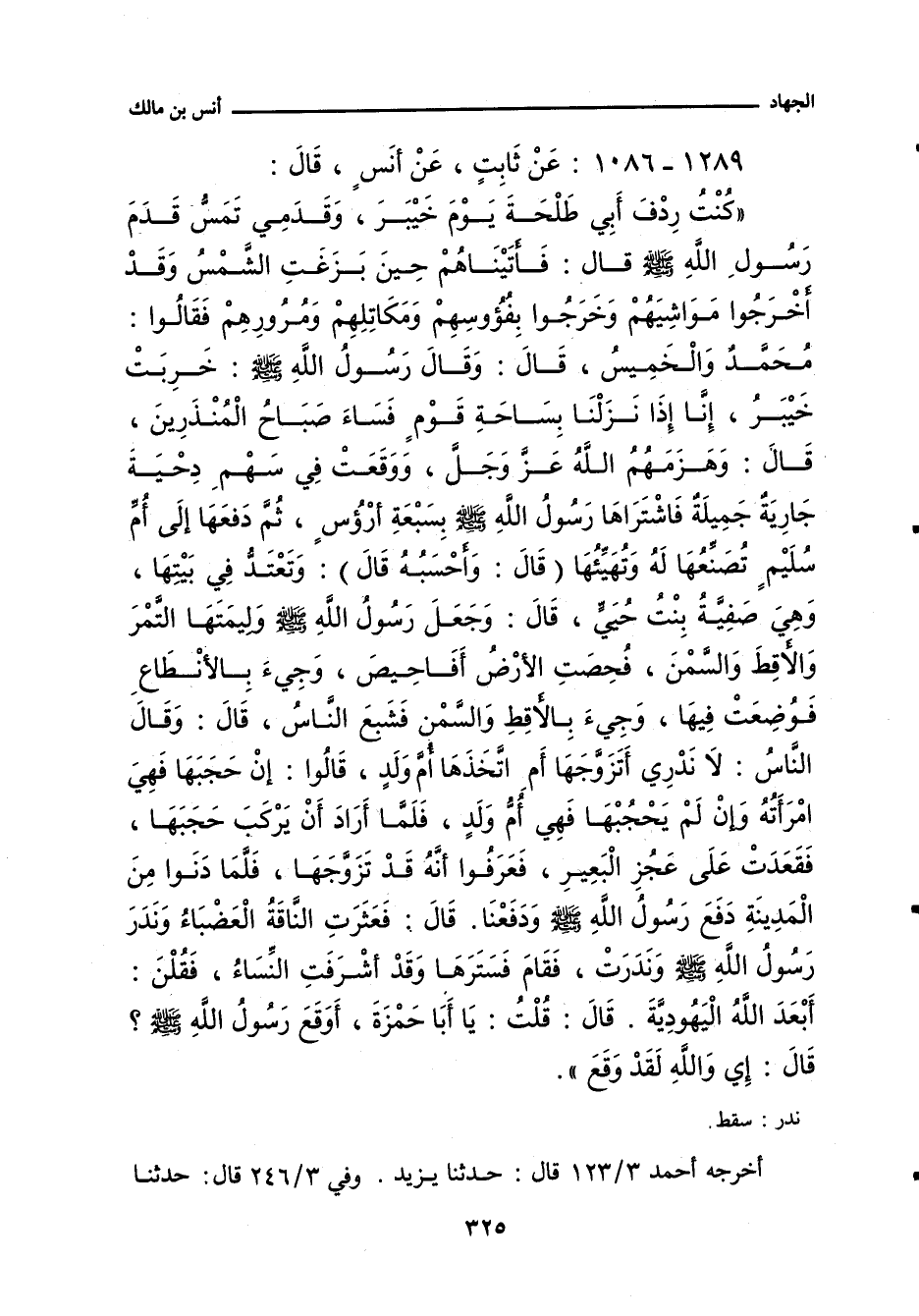 كُنْتُ رِدْفَ أَبِي طَلْحَةَ يَوْمَ خَيْبَرَ، وَقَدَمِي تَمَسُّ قَدَمَ رَسُولِ اللهِ صلى الله عليه وسلم، قَالَ: فَأَتَيْنَاهُمْ حِينَ بَزَغَتِ الشَّمْسُ، وَقَدْ أَخْرَجُوا مَوَاشِيَهُمَ، وَخَرَجُوا بِفُؤُوسِهِمْ وَمَكَاتِلِهِمْ وَمُرُورِهِمْ، فَقَالُوا: مُحَمَّدٌ وَالْخَمِيسُ، قَالَ: وَقَالَ رَسُولُ اللهِ صلى الله عليه وسلم: خَرِبَتْ خَيْبَرُ، إِنَّا إِذَا نَزَلْنَا بِسَاحَةِ قَوْمٍ فَسَاءَ صَبَاحُ الْمُنْذَرِينَ، قَالَ: وَهَزَمَهُمُ اللَّهُ، عَزَّ وَجَلَّ، وَوَقَعَتْ فِي سَهْمِ دَِحْيَةَ جَارِيَةٌ جَمِيلَةٌ، فَاشْتَرَاهَا رَسُولُ اللهِ صلى الله عليه وسلم بِسَبْعَةِ أَرْؤُسٍ، ثُمَّ دَفَعَهَا إِلَى أُمِّ سُلَيْمٍ تُصَنِّعُهَا لَهُ وَتُهَيِّئُهَا (قَالَ: وَأَحْسِبُهُ قَالَ): وَتَعْتَدُّ فِي بَيْتِهَا، وَهِيَ صَفِيَّةُ بِنْتُ حُيَيٍّ، قَالَ: وَجَعَلَ رَسُولُ اللهِ صلى الله عليه وسلم وَلِيمَتَهَا التَّمْرَ وَالأَقِطَ وَالسَّمْنَ، فُحِصَتِ الأَرْضُ أَفَاحِيصَ، وَجِيءَ بِالأَنْطَاعِ فَوُضِعَتْ فِيهَا، وَجِيءَ بِالأَقِطِ وَالسَّمْنِ، فَشَبِعَ النَّاسُ، قَالَ: وَقَالَ النَّاسُ: لَا نَدْرِي أَتَزَوَّجَهَا، أَمِ اتَّخَذَهَا أُمَّ وَلَدٍ؟ قَالُوا: إِنْ حَجَبَهَا فَهِْيَ امْرَأَتُهُ، وَإِنْ لَمْ يَحْجُبْهَا فَهِْيَ أُمُّ وَلَدٍ، فَلَمَّا أَرَادَ أَنْ يَرْكَبَ حَجَبَهَا، فَقَعَدَتْ عَلَى عَجُزِ الْبَعِيرِ، فَعَرَفُوا أَنَّهُ قَدْ تَزَوَّجَهَا، فَلَمَّا دَنَوْا مِنَ الْمَدِينَةِ دَفَعَ رَسُولُ اللهِ صلى الله عليه وسلم وَدَفَعْنَا، قَالَ: فَعَثَرَتِ النَّاقَةُ الْعَضْبَاءُ، وَنَدَرَ رَسُولُ اللهِ صلى الله عليه وسلم وَنَدَرَتْ، فَقَامَ فَسَتَرَهَا، وَقَدْ أَشْرَفَتِ النِّسَاءُ، فَقُلْنَ: أَبْعَدَ اللَّهُ