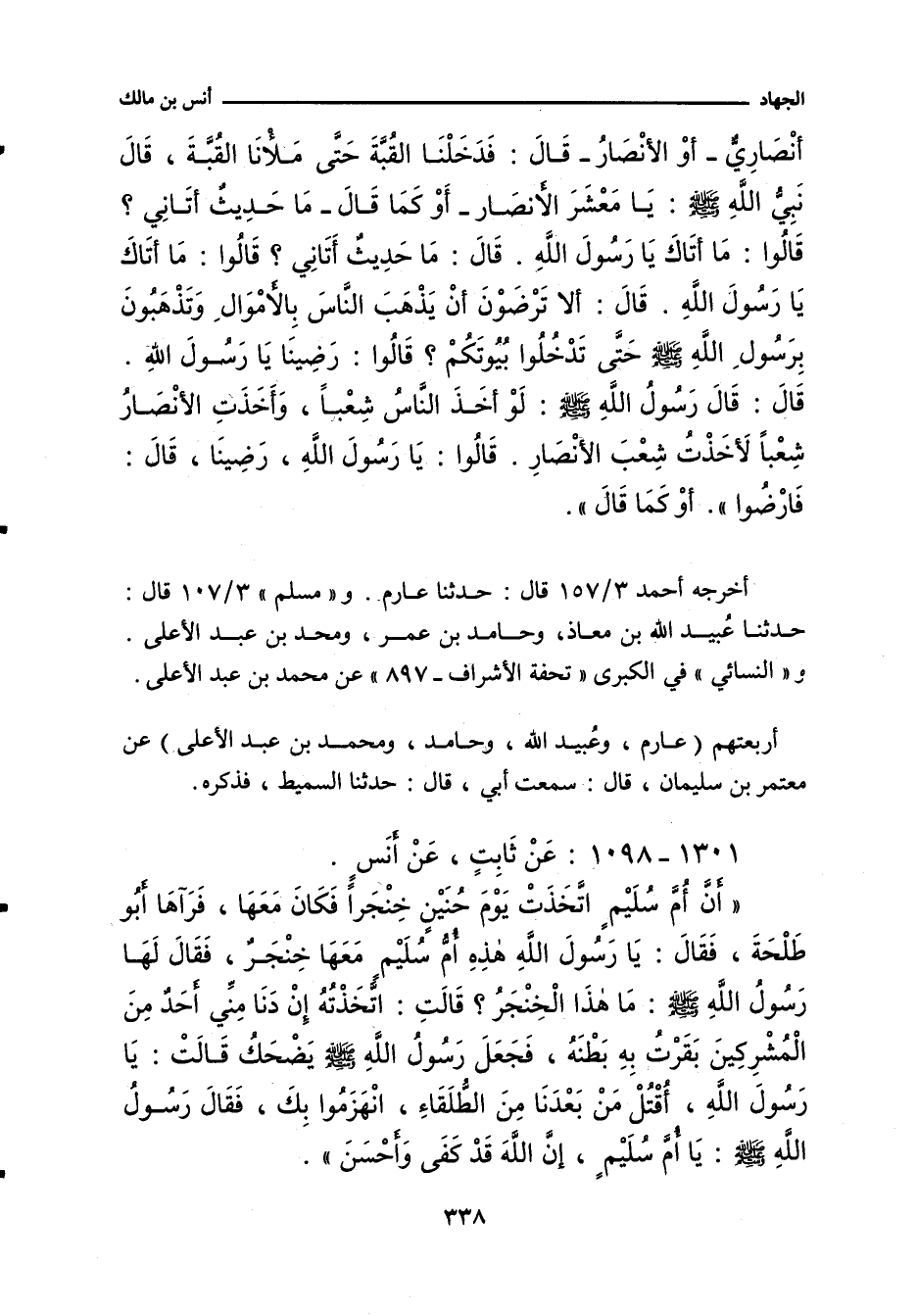 أَنَّ أُمَّ سُلَيْمٍ كَانَتْ مَعَ أَبِي طَلْحَةَ يَوْمَ حُنَيْنٍ، فَإِذَا مَعَ أُمِّ سُلَيْمٍ خِنْجَرٌ، فَقَالَ أَبُو طَلْحَةَ: مَا هَذَا مَعَكِ يَا أُمَّ سُلَيْمٍ؟ فَقَالَتْ أُمُّ سُلَيْمٍ: اتَّخَذْتُهُ، إنْ دَنَا مِنِّي أَحَدٌ مِنَ الْكُفَّارِ أَبْعَجُ بِهِ بَطْنَهُ، فَقَالَ أَبُو طَلْحَةَ: يَا نَبِيَّ اللهِ، أَلَا تَسْمَعُ مَا تَقُولُ أُمُّ سُلَيْمٍ؟ تَقُولُ: كَذَا وَكَذَا، فَقَالَتْ: يَا رَسُولَ اللهِ، اقْتُلْ مَنْ بَعْدَنَا مِنَ الطُّلَقَاءِ، انْهَزَمُوا بِكَ يَا رَسُولَ اللهِ، فَقَالَ: يَا أُمَّ سُلَيْمٍ، إِنَّ اللهَ، عَزَّ وَجَلَّ، قَدْ كَفَانَا وَأَحْسَنَ.