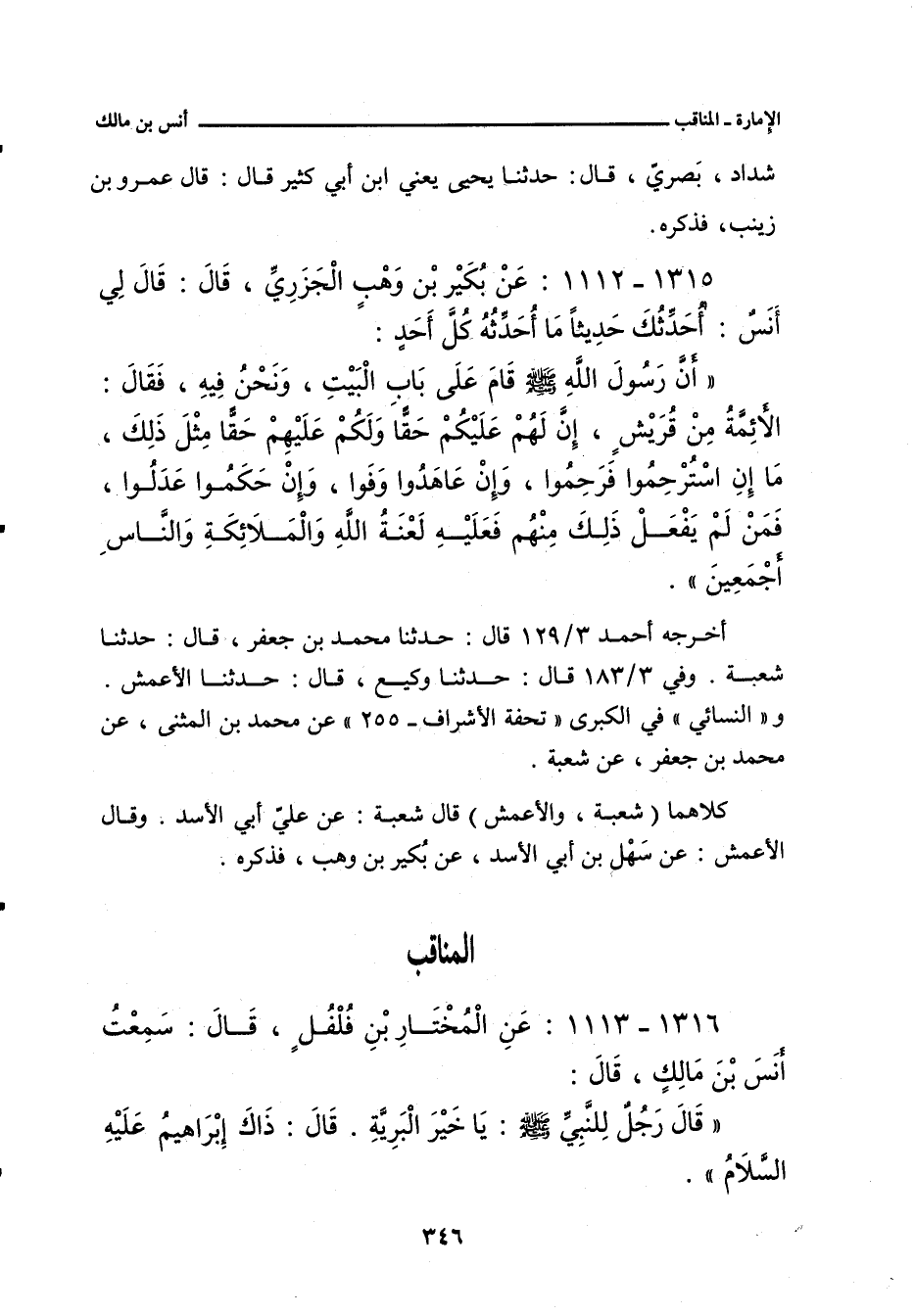 إِنَّ رَسُولَ اللهِ صلى الله عليه وسلم قَامَ عَلَى بَابِ الْبَيْتِ، وَنَحْنُ فِيهِ، فَقَالَ: الأَئِمَّةُ مِنْ قُرَيْشٍ، إِنَّ لَهُمْ عَلَيْكُمْ حَقًّا، وَلَكُمْ عَلَيْهِمْ حَقًّا مِثْلَ ذَلِكَ، مَا إِنِ اسْتُرْحِمُوا فَرَحِمُوا، وَإِنْ عَاهَدُوا وَفَوْا، وَإِنْ حَكَمُوا عَدَلُوا، فَمَنْ لَمْ يَفْعَلْ ذَلِكَ مِنْهُمْ، فَعَلَيْهِ لَعْنَةُ اللهِ وَالْمَلَائِكَةِ وَالنَّاسِ أَجْمَعِينَ.