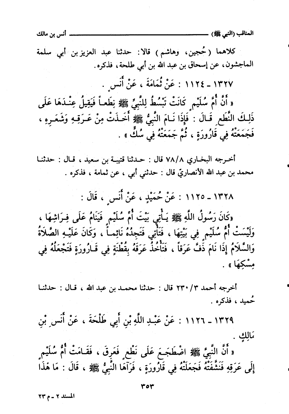 أَنَّ أُمَّ سُلَيْمٍ كَانَتْ تَبْسُطُ لِلنَّبِيِّ صلى الله عليه وسلم نِطَعًا، فَيَقِيلُ عِنْدَهَا عَلَى ذَلِكَ النِّطَعِ، قَالَ: فَإِذَا نَامَ النَّبِيُّ صلى الله عليه وسلم أَخَذَتْ مِنْ عَرَقِهِ وَشَعَْرِهِ، فَجَمَعَتْهُ فِي قَارُورَةٍ، ثُمَّ جَمَعَتْهُ فِي سُكٍّ.