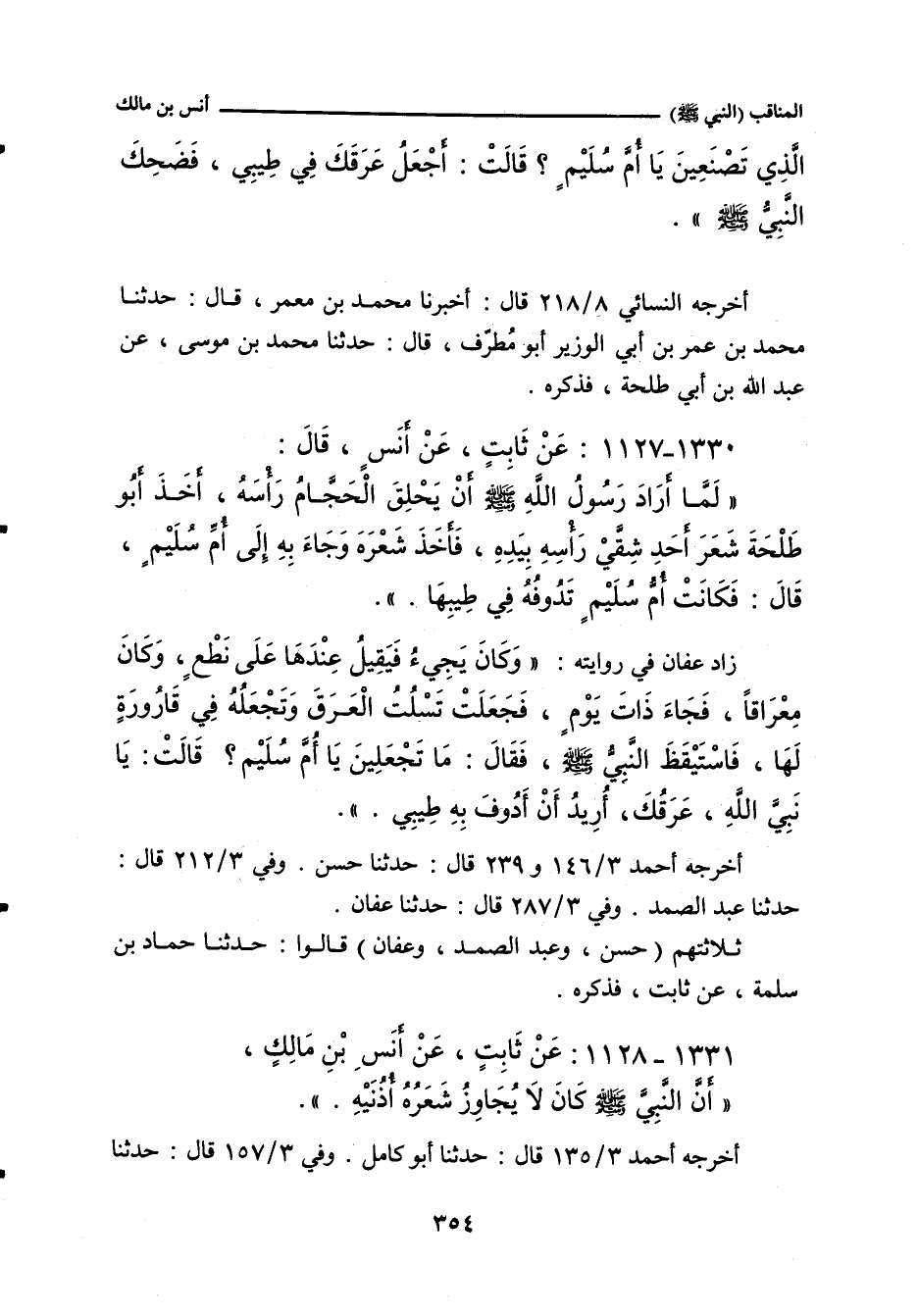 - لفظ عَفَّان: أَنَّ النَّبِيَّ صلى الله عليه وسلم لَمَّا أَرَادَ أنْ يَحْلِقَ رَأْسَهُ بِمِنًى، أَخَذَ أَبُو طَلْحَةَ شِقَّ رَأْسِهِ، فَحَلَقَ الْحَجَّامُ، فَجَاءَ بِهِ إِلَى أُمِّ سُلَيْمٍ، وَكَانَتْ أُمُّ سُلَيْمٍ تَجْعَلُهُ فِي مِسْكِهَا، وَكَانَ يَجِيءُ فَيَقِيلُ عِنْدَهَا عَلَى نَِطْعٍ، وَكَانَ مِعْرَاقًا، فَجَاءَ ذَاتَ يَوْمٍ، فَجَعَلَتْ تَسْلُتُ الْعَرَقَ وَتَجْعَلُهُ فِي قَارُورَةٍ لَهَا، فَاسْتَيْقَظَ النَّبِيُّ صلى الله عليه وسلم، فَقَالَ: مَا تَجْعَلِينَ يَا أُمَّ سُلَيْمٍ؟ قَالَتْ: يَا نَبِيَّ اللهِ، عَرَقُكَ أُرِيدُ أنْ أَدُوفَ بِهِ طِيبِي.