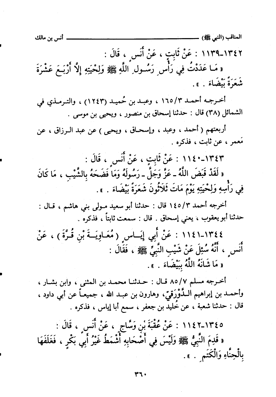 ١٣٤٣ - عَنْ ثَابِتٍ، قَالَ: سَأَلْتُ أَنَسًا: هَلْ شَمِطَ رَسُولَ اللهِ صلى الله عليه وسلم؟ قَالَ: