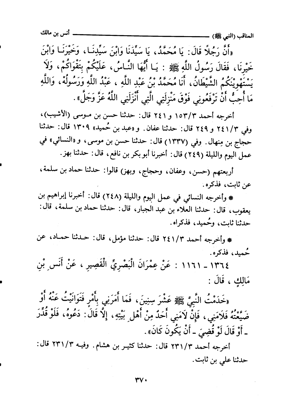 أَنَّ رَجُلاً قَالَ: يَا مُحَمَّدُ، يَا سَيِّدَنَا وَابْنَ سَيِّدِنَا، وَخَيْرَنَا وَابْنَ خَيْرِنَا، فَقَالَ رَسُولُ اللهِ صلى الله عليه وسلم: أَيُّهَا النَّاسُ، عَلَيْكُمْ بِتَقْوَاكُمْ، وَلَا يَسْتَهْوِيَنَّكمُ الشَّيْطَانُ، أَنَا مُحَمَّدُ بْنُ عَبْدِ اللهِ، عَبْدُ اللهِ وَرَسُولُهُ، وَاللهِ مَا أُحِبُّ أَنْ تَرْفَعُونِي فَوْقَ مَنْزِلَتِي الَّتِي أَنْزَلَنِي اللَّهُ، عَزَّ وَجَلَّ.