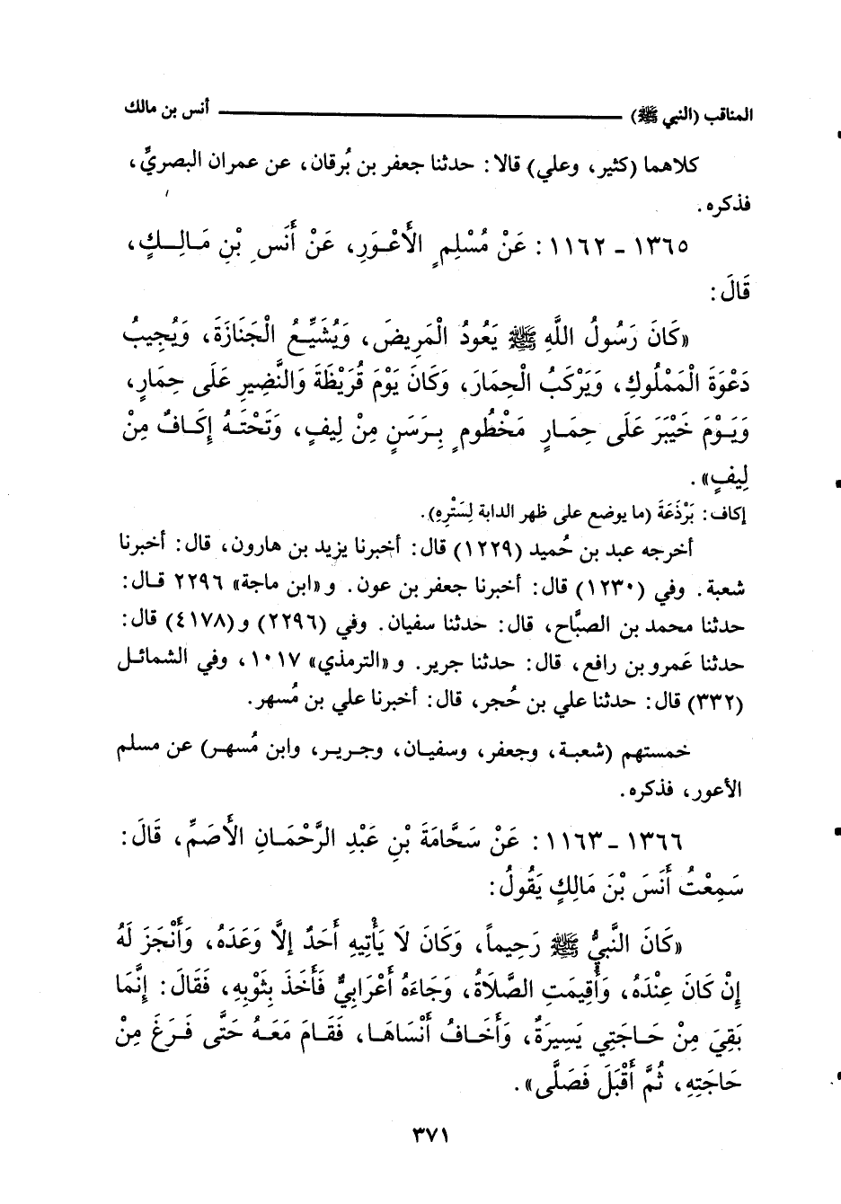 - لفظ فُضَيْل: كَانَ رَسُولُ اللهِ صلى الله عليه وسلم يُجِيبُ الْعَبْدَ، وَيَعُودُ الْمَرِيضَ، وَيَرْكَبُ الْحِمَارَ.