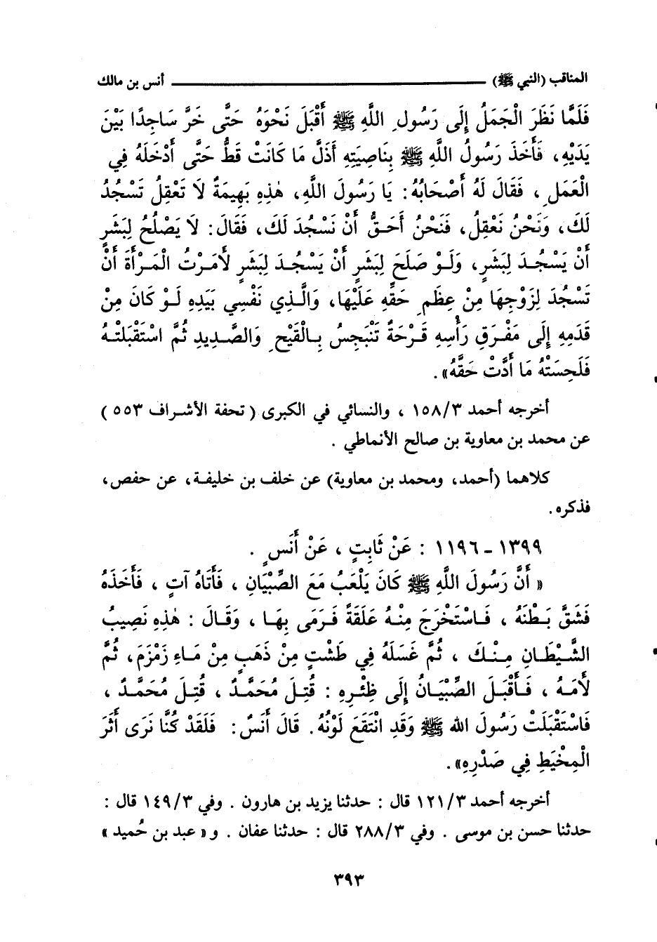 فَلَمَّا نَظَرَ الْجَمَلُ إِلَى رَسُولِ اللهِ صلى الله عليه وسلم، أَقْبَلَ نَحْوَهُ، حَتَّى خَرَّ سَاجِدًا بَيْنَ يَدَيْهِ، فَأَخَذَ رَسُولُ اللهِ صلى الله عليه وسلم بِنَاصِيَتِهِ، أَذَلَّ مَا كَانَتْ قَطُّ، حَتَّى أَدْخَلَهُ فِي الْعَمَلِ، فَقَالَ لَهُ أَصْحَابُهُ: يَا رَسُولَ اللهِ، هَذِهِ بَهِيمَةٌ لَا تَعْقِلُ تَسْجُدُ لَكَ، وَنَحْنُ نَعْقِلُ، فَنَحْنُ أَحَقُّ أَنْ نَسْجُدَ لَكَ، فَقَالَ: لَا يَصْلُحُ لِبَشَرٍ أَنْ يَسْجُدَ لِبَشَرٍ، وَلَوْ صَلَحَ لِبَشَرٍ أَنْ يَسْجُدَ لِبَشَرٍ، لأَمَرْتُ الْمَرْأَةَ أَنْ تَسْجُدَ لِزَوْجِهَا، مِنْ عِظَمِ حَقِّهِ عَلَيْهَا، وَالَّذِي نَفْسِي بِيَدِهِ، لَوْ كَانَ مِنْ قَدَمِهِ إِلَى مَفْرِقِ رَأْسِهِ قُرْحَةً، تَنْبَجِسُ بِالْقَيْحِ وَالصَّدِيدِ، ثُمَّ اسْتَقْبَلَتْهُ فَلَحَسَتْهُ، مَا أَدَّتْ حَقَّهُ.