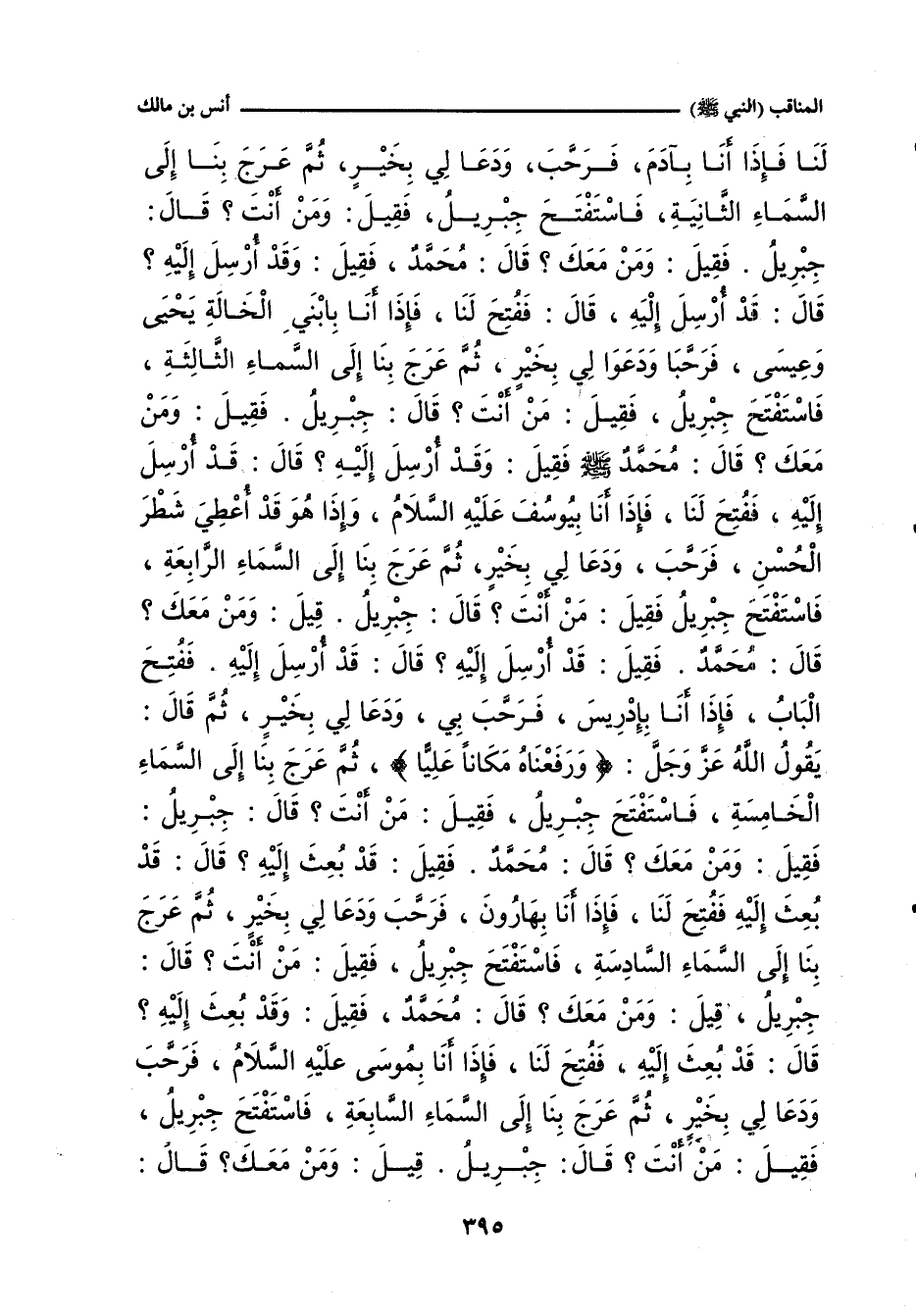 أُعْطِيَ شَطْرَ الْحُسْنِ، فَرَحَّبَ، وَدَعَا لِي بِخَيْرٍ، ثُمَّ عُرِجَ بِنَا إِلَى السَّمَاءِ الرَّابِعَةِ، فَاسْتَفْتَحَ جِبْرِيلُ، فَقِيلَ: مَنْ أَنْتَ؟ قَالَ: جِبْرِيلُ، قِيلَ: وَمَنْ مَعَكَ؟ قَالَ: مُحَمَّدٌ، فَقِيلَ: قَدْ أُرْسِلَ إِلَيْهِ؟ قَالَ: قَدْ أُرْسِلَ إِلَيْهِ، فَفُتِحَ الْبَابُ، فَإِذَا أَنَا بِإِدْرِيسَ، فَرَحَّبَ بِي، وَدَعَا لِي بِخَيْرٍ، ثُمَّ قَالَ: يَقُولُ اللَّهُ، عَزَّ وَجَلَّ: وَرَفَعْنَاهُ مَكَانًا عَلِيًّا)، ثُمَّ عُرِجَ بِنَا إِلَى السَّمَاءِ الْخَامِسَةِ، فَاسْتَفْتَحَ جِبْرِيلُ، فَقِيلَ: مَنْ أَنْتَ؟ قَالَ: جِبْرِيلُ، فَقِيلَ: وَمَنْ مَعَكَ؟ قَالَ: مُحَمَّدٌ، فَقِيلَ: قَدْ بُعِثَ إِلَيْهِ؟ قَالَ: قد بُعِثَ إِلَيْهِ، فَفُتِحَ لَنَا، فَإِذَا أَنَا بِهَارُونَ، فَرَحَّبَ، وَدَعَا لِي بِخَيْرٍ، ثُمَّ عُرِجَ بِنَا إِلَى السَّمَاءِ السَّادِسَةِ، فَاسْتَفْتَحَ جِبْرِيلُ، فَقِيلَ: مَنْ أَنْتَ؟ قَالَ: جِبْرِيلُ، قِيلَ: وَمَنْ مَعَكَ؟ قَالَ: مُحَمَّدٌ، فَقِيلَ: وَقَدْ بُعِثَ إِلَيْهِ؟ قَالَ: قَدْ بُعِثَ إِلَيْهِ، فَفُتِحَ لَنَا، فَإِذَا أَنَا بِمُوسَى، عَلَيْهِ السَّلَامُ، فَرَحَّبَ، وَدَعَا لِي بِخَيْرٍ، ثُمَّ عُرِجَ بِنَا إِلَى السَّمَاءِ السَّابِعَةِ، فَاسْتَفْتَحَ جِبْرِيلُ، فَقِيلَ: مَنْ أَنْتَ؟ قَالَ: جِبْرِيلُ، قِيلَ: وَمَنْ مَعَكَ؟ قَالَ: