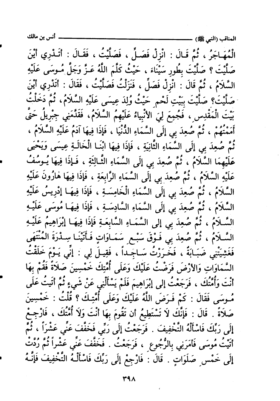عَلَيْهِ السَّلَامُ، ثُمَّ صُعِدَ بِي فَوْقَ سَبْعِ سَمَاوَاتٍ، فَأَتَيْنَا سِدْرَةَ الْمُنْتَهَى، فَغَشِيَتْنِي ضَبَابَةٌ، فَخَرَرْتُ سَاجِدًا، فَقِيلَ لِي: إِنِّي يَوْمَ خَلَقْتُ السَّمَاوَاتِ وَالأَرْضَ فَرَضْتُ عَلَيْكَ وَعَلَى أُمَّتِكَ خَمْسِينَ صَلَاةً، فَقُمْ بِهَا أَنْتَ وَأُمَّتُكَ، فَرَجَعْتُ إِلَى إِبْرَاهِيمَ، فَلَمْ يَسْأَلْنِي عَنْ شَيْءٍ، ثُمَّ أَتَيْتُ عَلَى مُوسَى، فَقَالَ: كَمْ فَرَضَ اللَّهُ عَلَيْكَ وَعَلَى أُمَّتِكَ؟ قُلْتُ: خَمْسِينَ صَلَاةً، قَالَ: فَإِنَّكَ لَا تَسْتَطِيعُ أَنْ تَقُومَ بِهَا أَنْتَ وَلَا أُمَّتُكَ، فَارْجِعْ إِلَى رَبِّكَ فَاسْأَلْهُ التَّخْفِيفَ، فَرَجَعْتُ إِلَى رَبِّي، فَخَفَّفَ عَنِّي عَشْرًا، ثُمَّ أَتَيْتُ مُوسَى، فَأَمَرَنِى بِالرُّجُوعِ، فَرَجَعْتُ، فَخَفَّفَ عَنِّي عَشْرًا، ثُمَّ رُدَّتْ إِلَى خَمْسِ صَلَوَاتٍ، قَالَ: فَارْجِعْ إِلَى رَبِّكَ فَاسْأَلْهُ التَّخْفِيفَ، فَإِنَّهُ