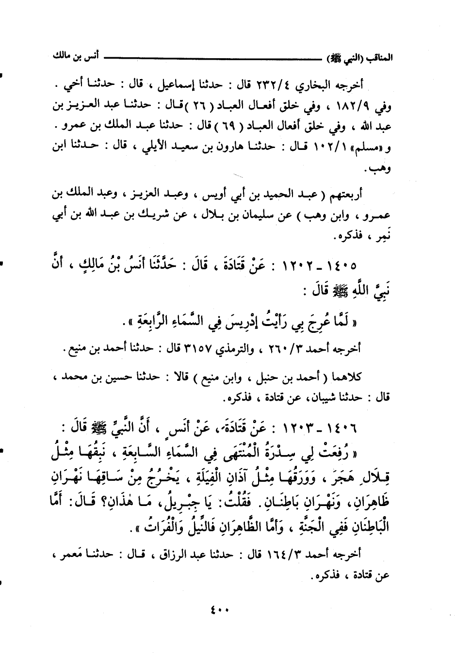 ١٤٠٥ - عَنْ قَتَادَةَ، قَالَ: حَدَّثَنَا أَنَسُ بْنُ مَالِكٍ، أَنَّ نَبِيَّ اللهِ صلى الله عليه وسلم قَالَ: